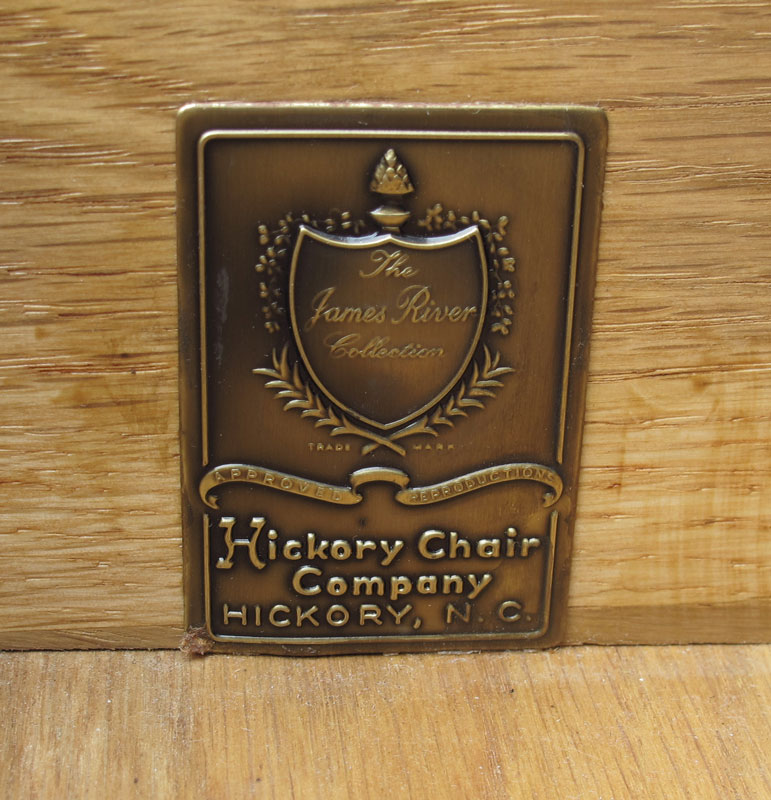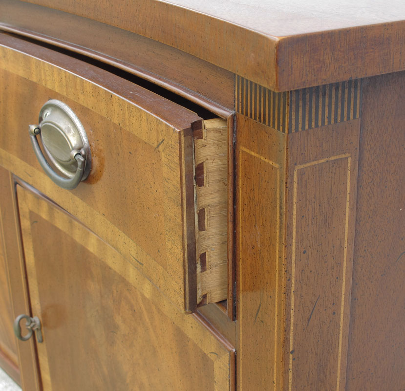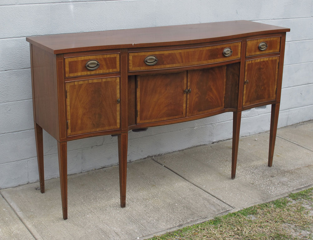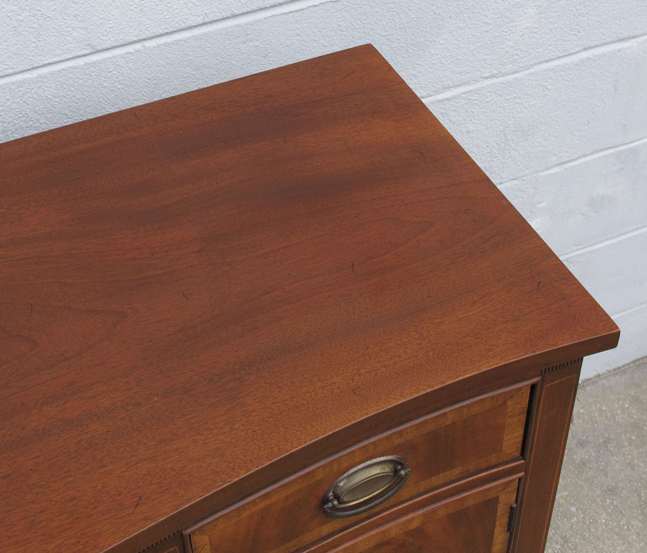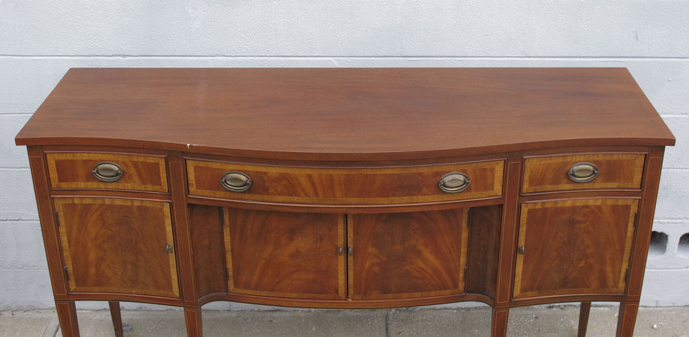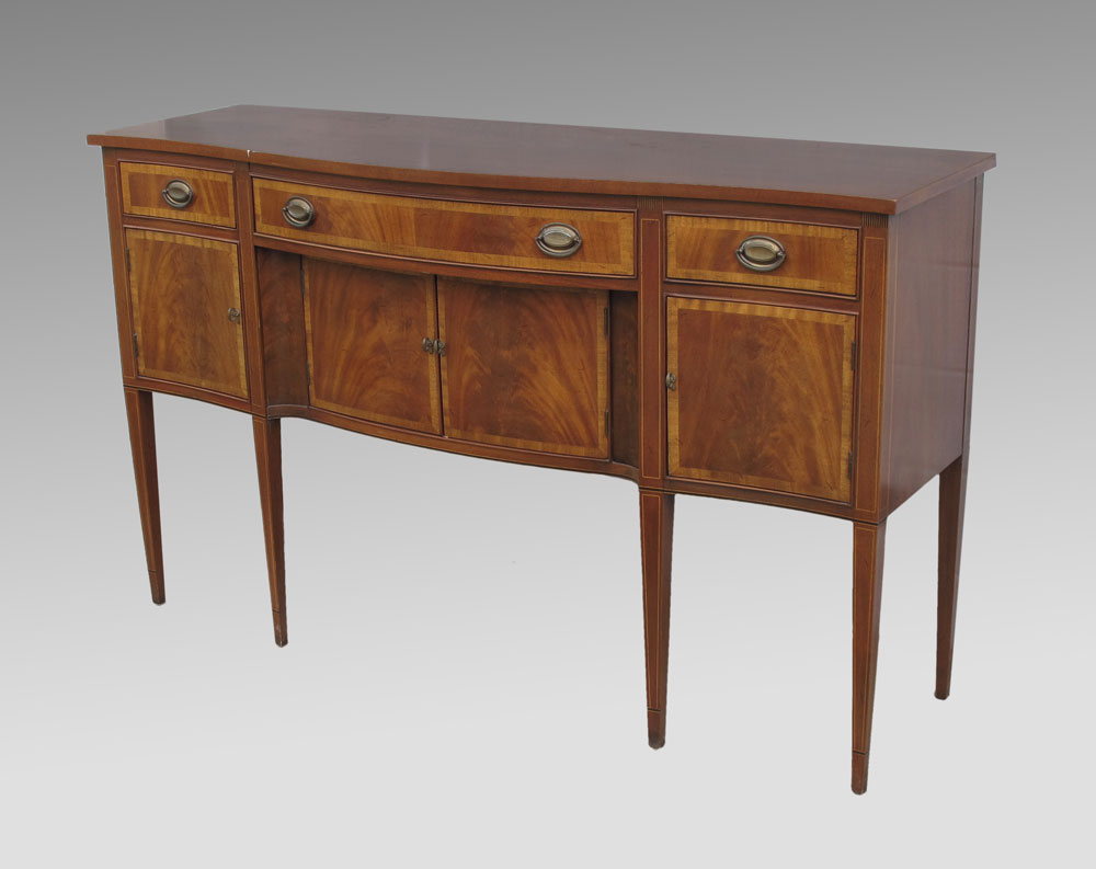 HICKORY CHAIR CO. HEPPLEWHITE STYLE SIDEBOARD: Swell front 3 drawer over 4 doors, banded mahogany veneer, string inlay tapered legs. Metal label. 41'' h. x 68'' x 23''