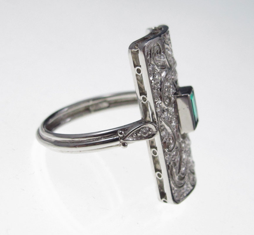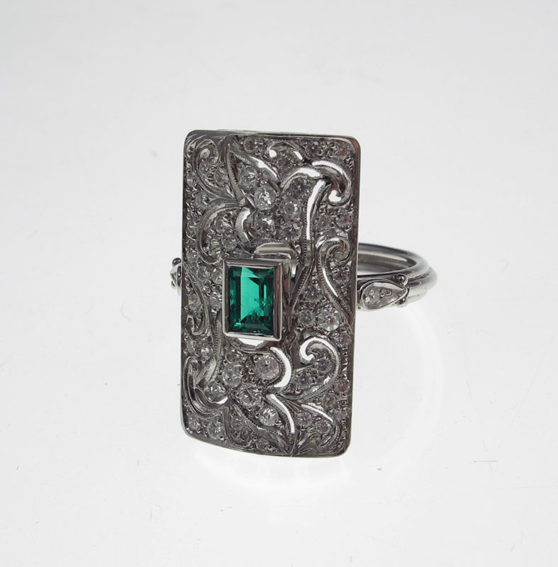18K EMERALD & DIAMOND FILIGREE RING: Hand made 18K white gold ring centers one emerald cut emerald. Weight: .25 Ct. Approx. Rated SI in clarity (Type III), G in Hue, 4-5 in Tone and 4 in Saturation. Fifty one round full cut, European cut and single cut diamonds. Weight: .75 Ct. Approx. The diamonds average VS-SI in clarity and H-I in color. The emerald is bezel set. The diamonds are bead set. Weight: 8.1 grams. Size: 7