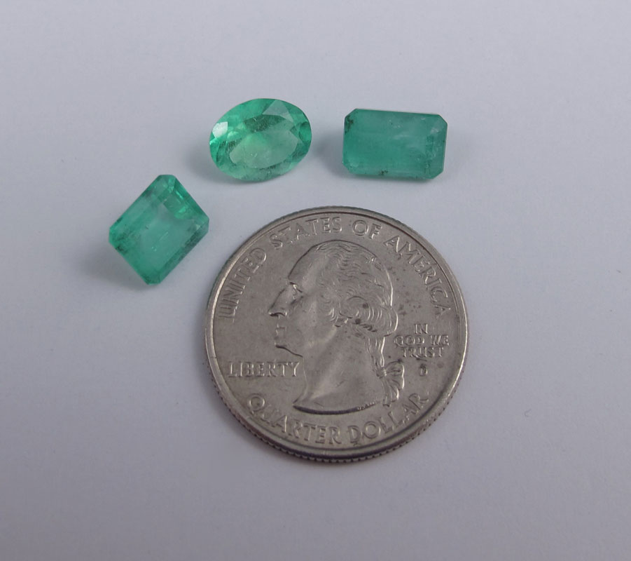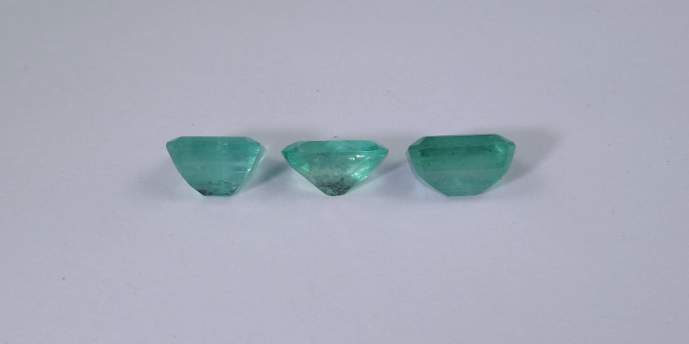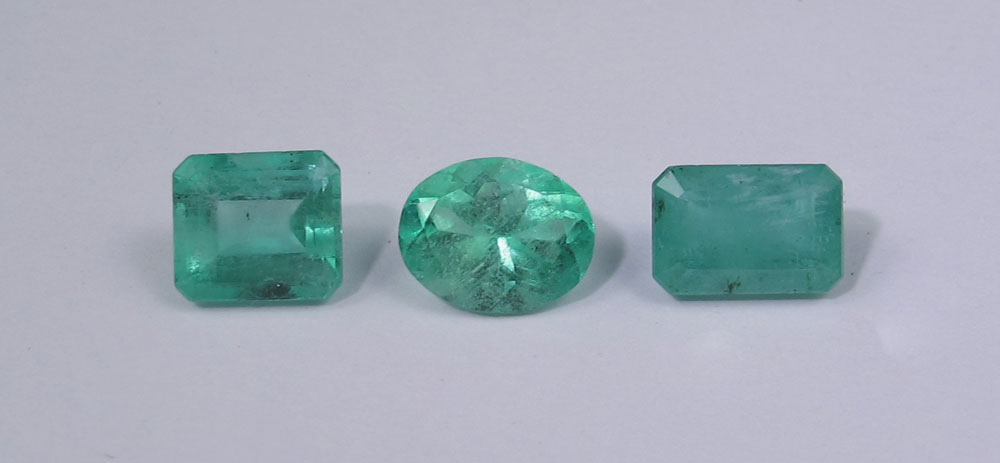 3 LOOSE EMERALDS - ALL OVER 2 CT EACH: 1) Emerald cut emerald. Weight: 2.57 Ct. Rated VS in clarity (Type III), G in Hue, 3 in Tone and 2-3 in Saturation. 2) Emerald cut emerald. Weight: 2.20 Ct. Rated SI in clarity (Type III), G in Hue, 3 in Tone and 2-3 in Saturation. 3) Oval mixed cut emerald. Weight: 2.12 Ct. Rated VS in clarity (Type III), G in Hue, 3 in Tone and 2-3 in Saturation.