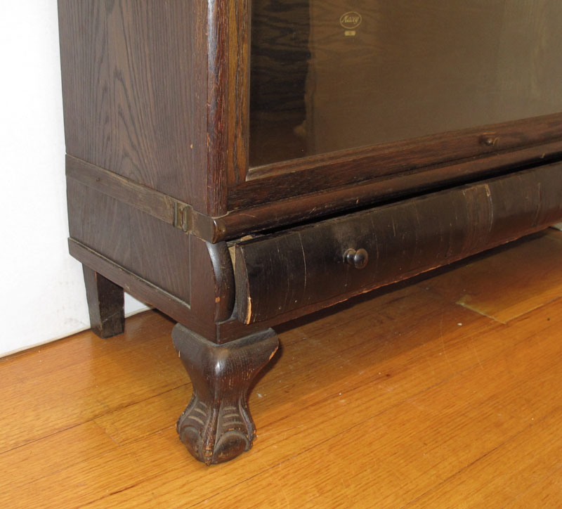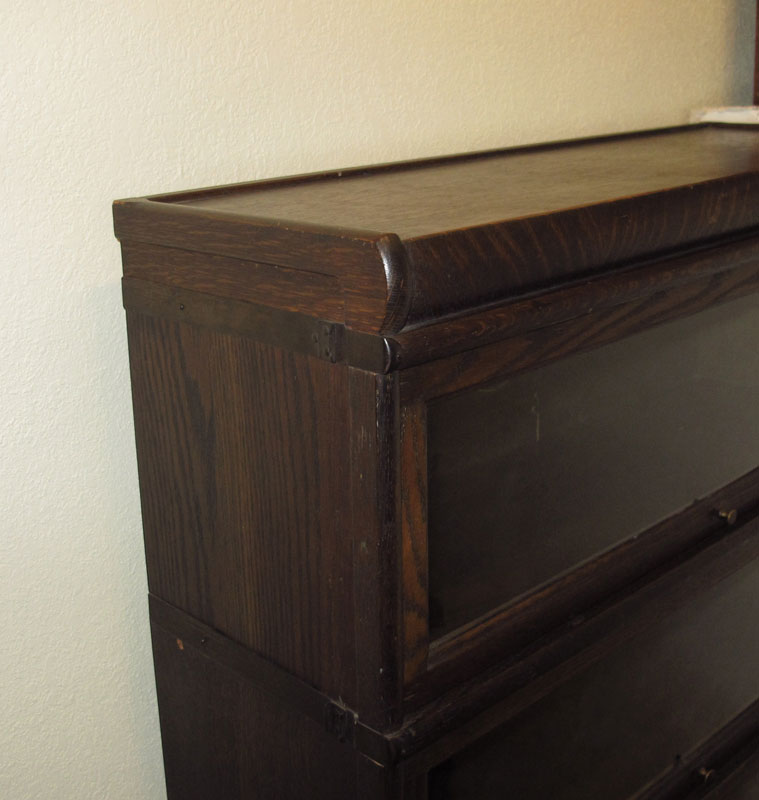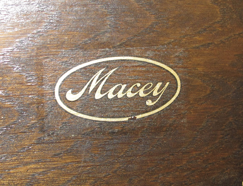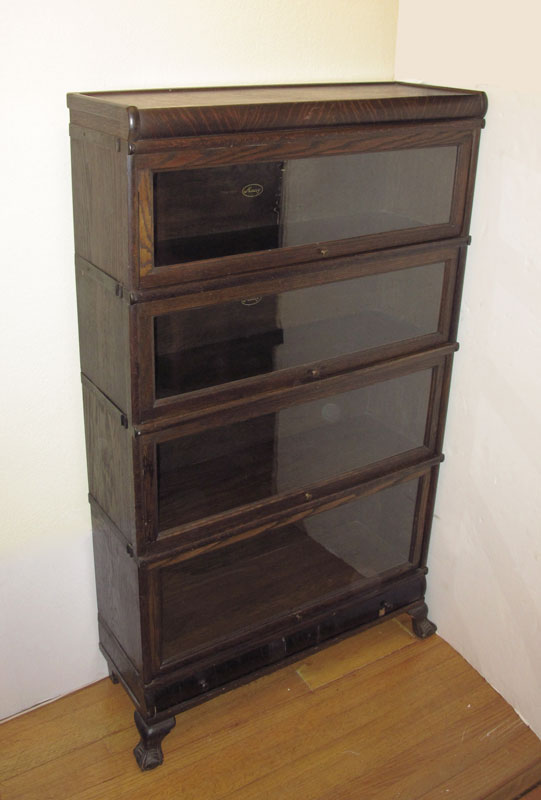 MACEY OAK 4 STACK BARRISTERS BOOKCASE: Four metal banded sections graduating in size, each with the Macey label. Single drawer at the base.