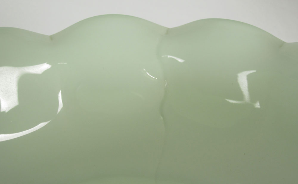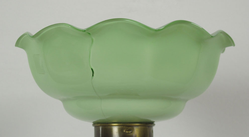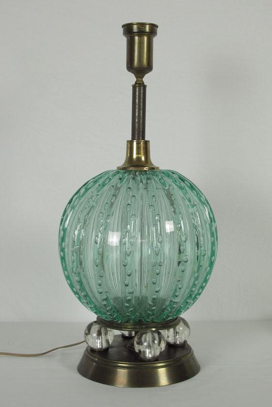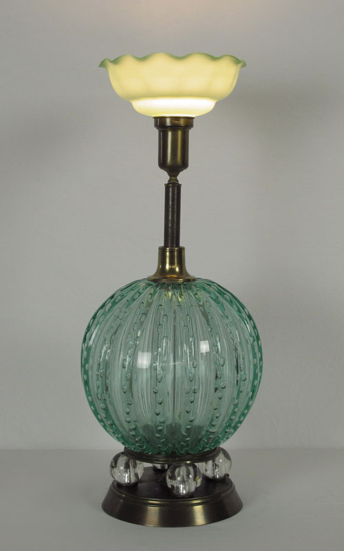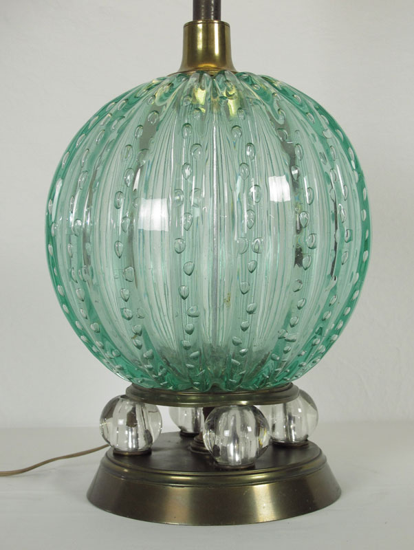 MURANO BAROVIA BOLICANTE GREEN GLASS LAMP: Transparent green bubble glass base with 4 clear glass ball feet on metal base. Green glass flower form shade. Overall 28 1/4'' h. x 11'' dia.