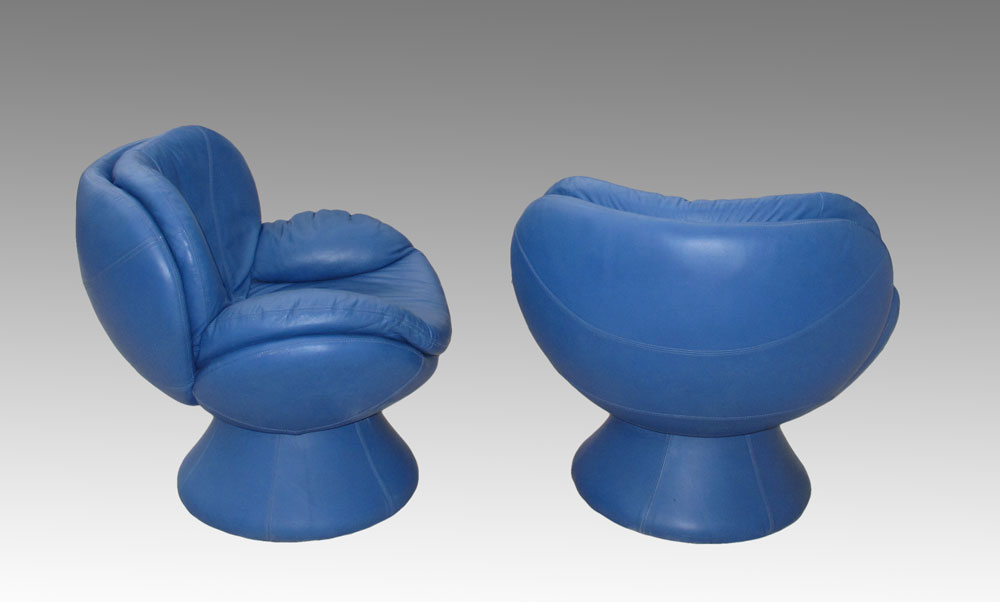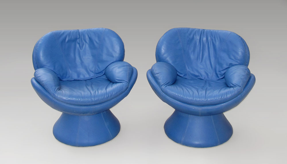 PAIR BLUE LEATHER CHAIRS: Fit like a glove, 360 degree swivel base. 32'' x 34 1/2'' x 32''.