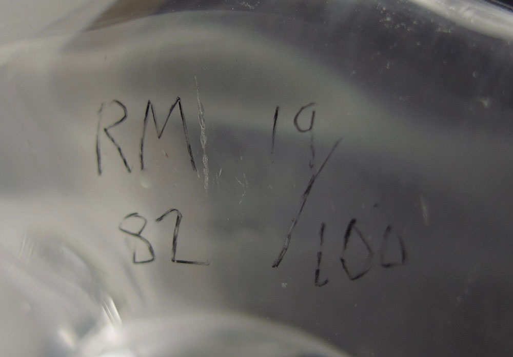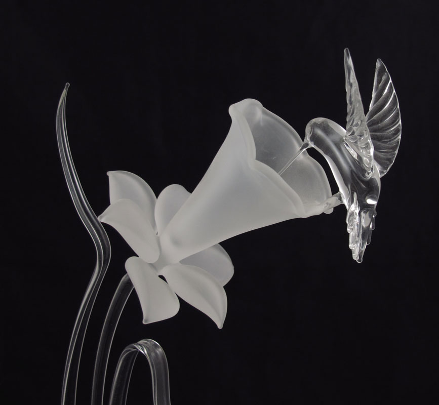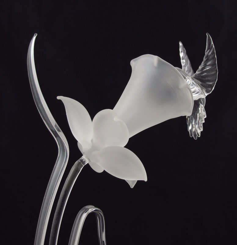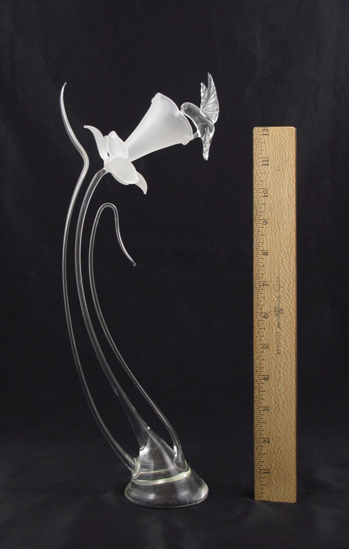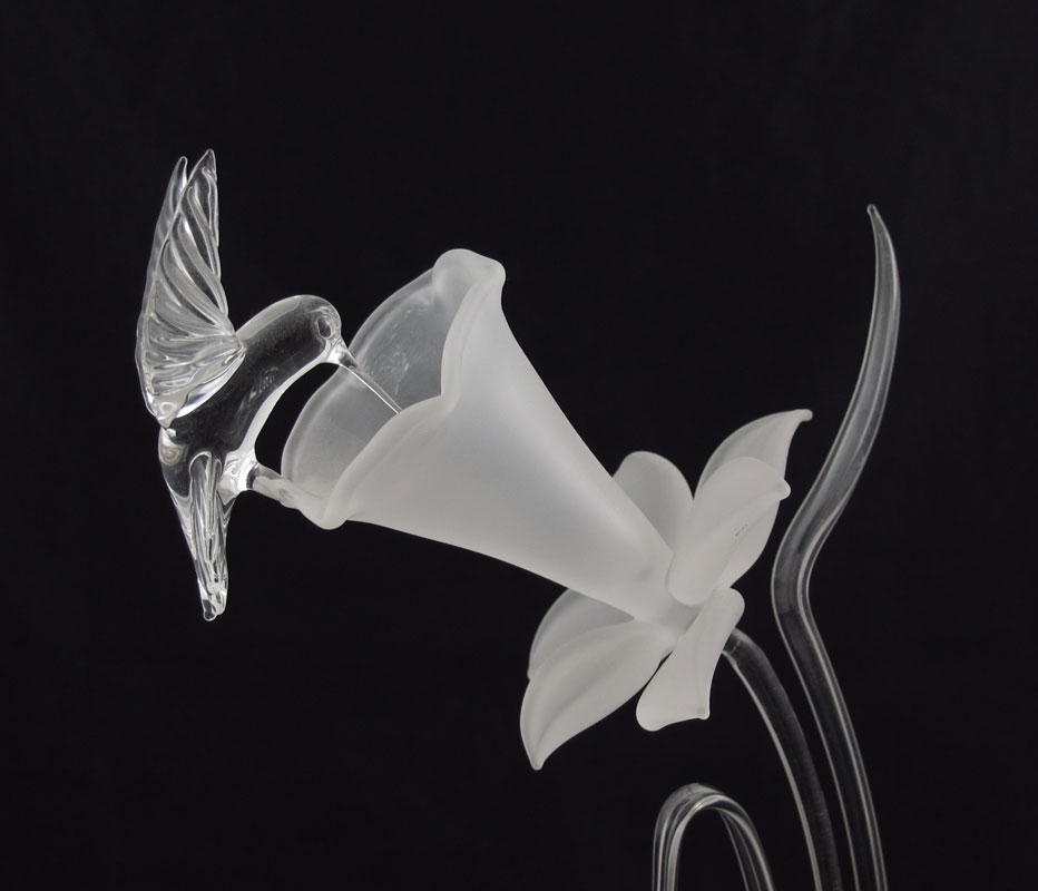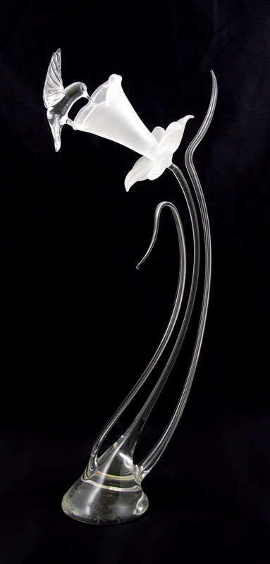 ROBERT MICKELSEN GLASS SCULPTURE: Flameworked glass by Robert Mickelsen. His works are seen in The Carnegie Museum of Art, Corning Museum of Glass, Cleveland Museum of Art and the Museum of American Glass at Wheaton Village, among a few. Graceful frosted and clear glass sculpture of a hummingbird and daffodil. Approx. 14'' tall, 5'' wide. View the artist at work at http://www.youtube.com/watch?v=JQJv-CGQDYU .