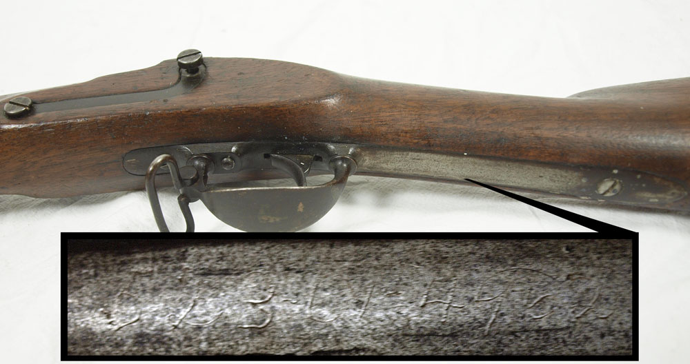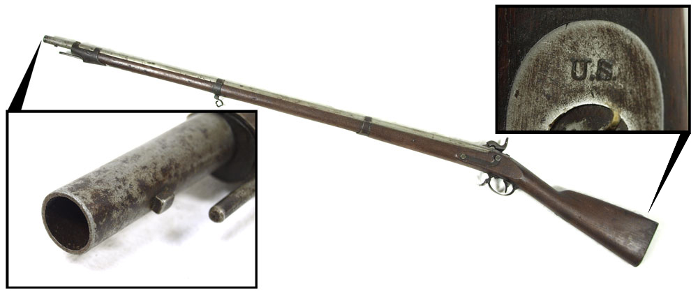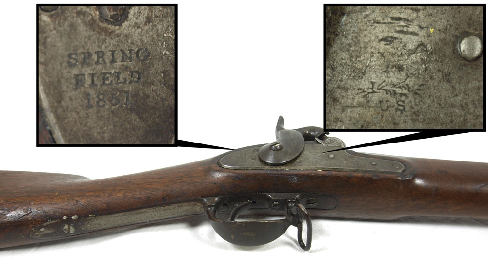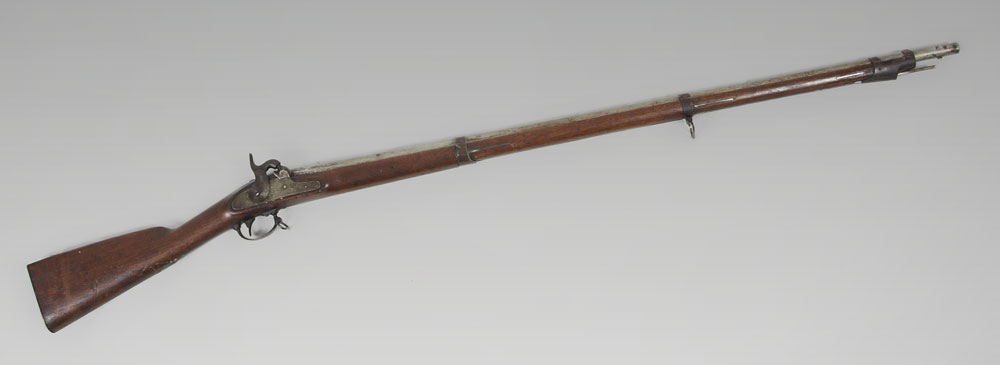 RARE 1851 US SPRINGFIELD CADET MUSKET: Lock dated 1851, partial eagle and US remain on plate, .57 caliber, 40'' barrel. Inspector marks V.P. on barrel, US stamp on butt hardware. According to Flayderman 300 of the 4000 rifles produced went to cadets at VMI. From Southern family, however cannot verify Confederate use. Measures 55'' overall.