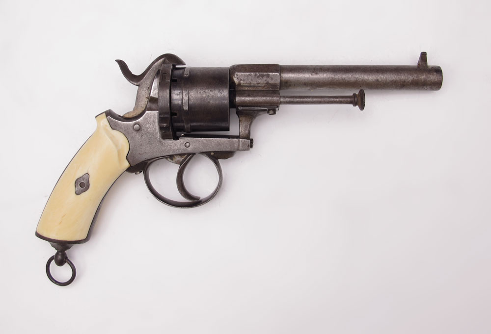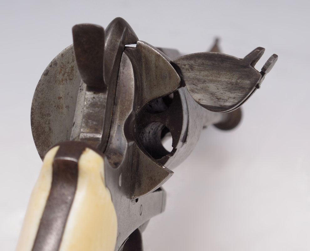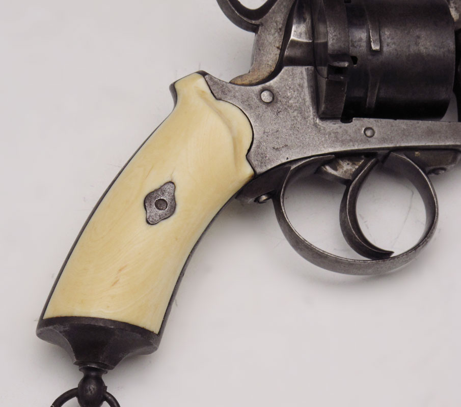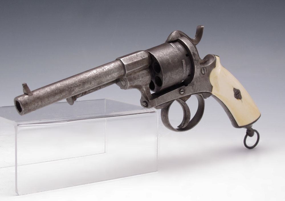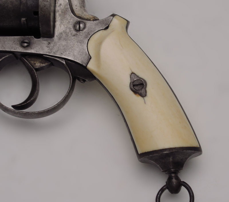 CIVIL WAR ERA IVORY GRIP BELGIAN PINFIRE PISTOL: Popular with Southern soldiers as a sidearm, Belgian proof marks on cylinder, nice action. Nice ivory grips enhance this gun considerably from the average model. 5'' barrel, original carrying ring still attached. 9'' overall.