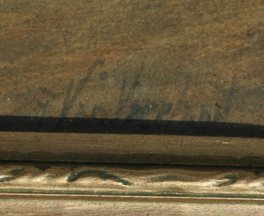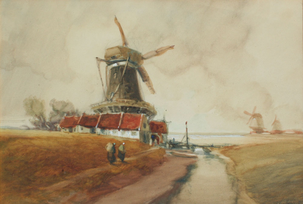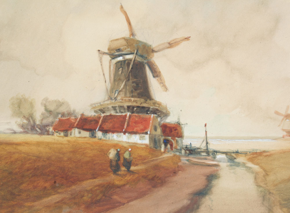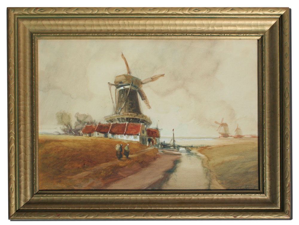 VAN VREELAND, Francis William, (American, 1879-1954): Dutch Landscape with Windmill and Figures Traveling on a Path, Watercolor, sight size 13 1/2'' x 20 1/2'', signed, gilded and carved frame with wear, 19'' x 25 1/2''. Vreeland worked at Rockwood Pottery Company, studied at the Cincinnati Art Academy.