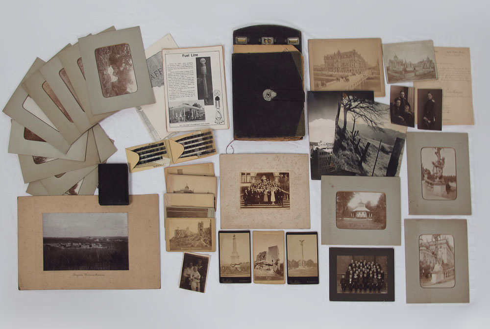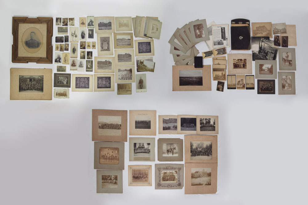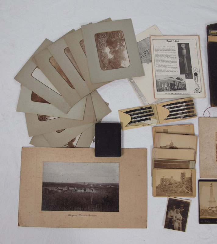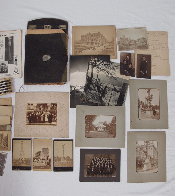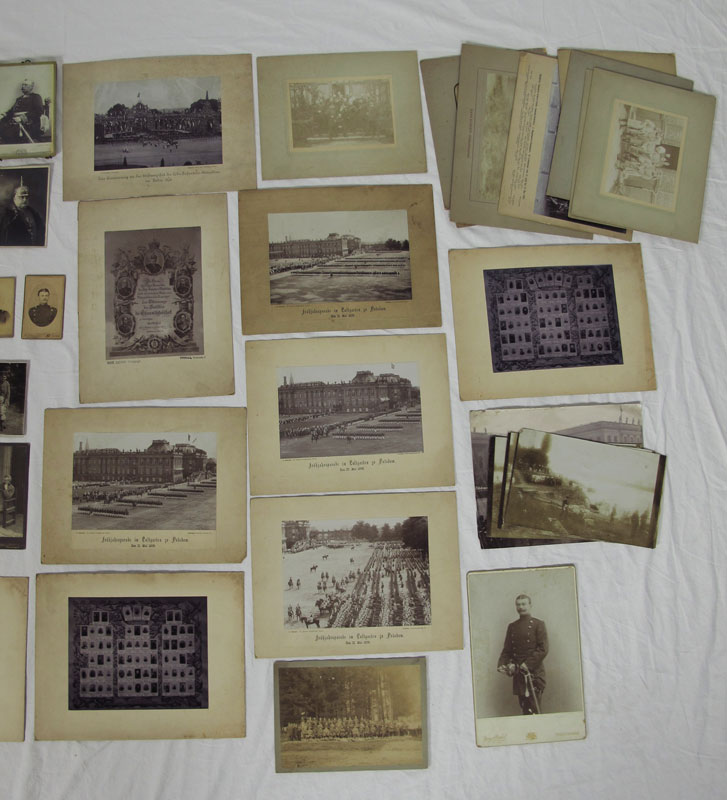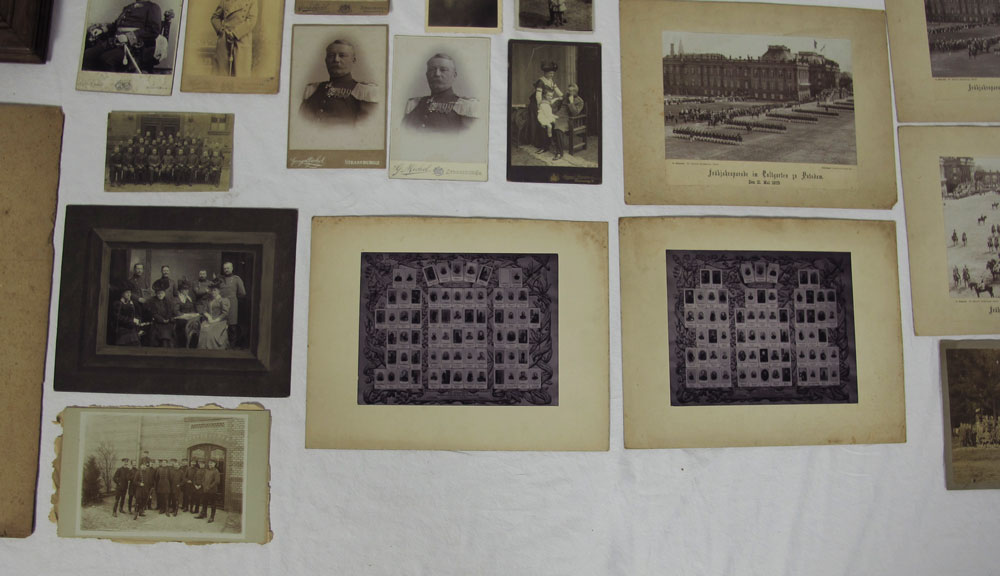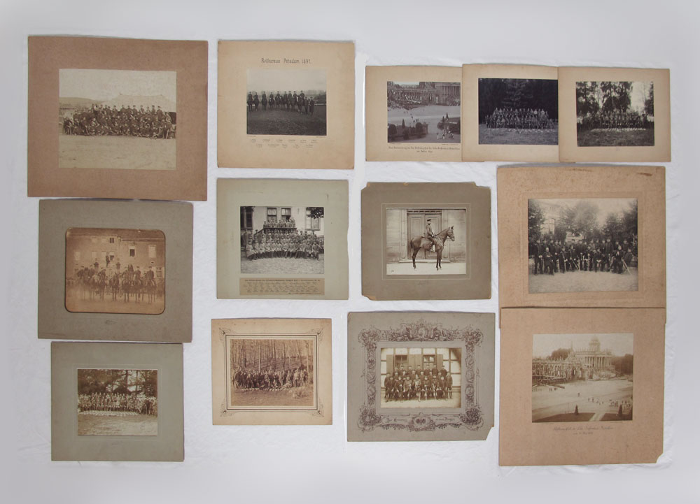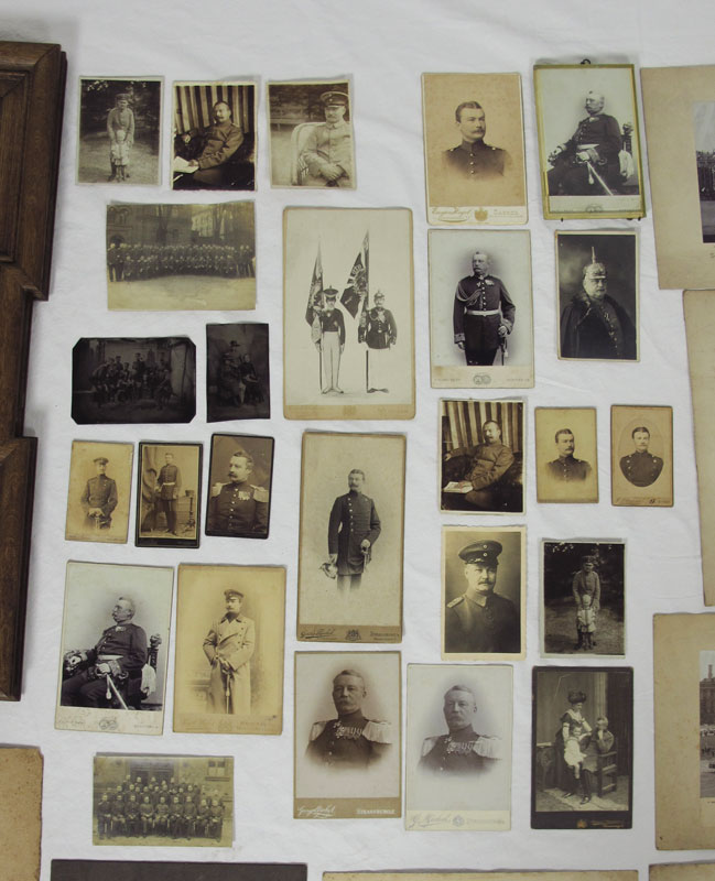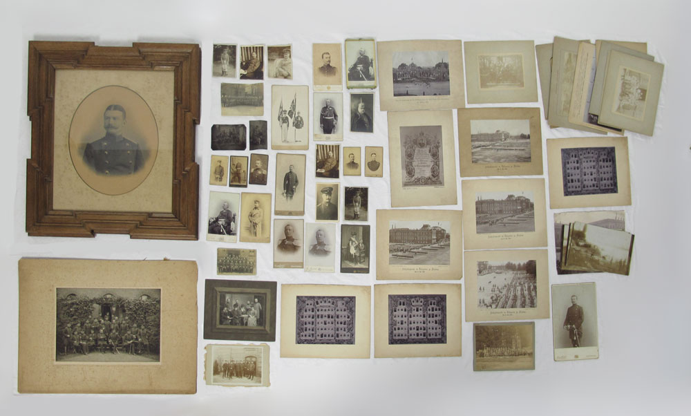 LARGE COLLECTION OF IMPERIAL GERMAN ARMY PHOTOGRAPHS: Approx. 61 photographs circa late 19th to early 20th century of assorted German Regiments an individuals. One is a tintype. Several feature Cavalry with horses. Also include are 4 turn of the century hunt club photographs, 25 scenic photographs of the same time period, WWI-WWII era German field clipboard, early non glare field mirror in case. Largest framed photo measures 26 1/4'' x 23 1/4''.