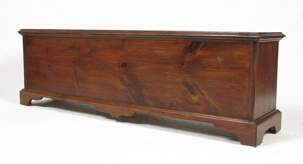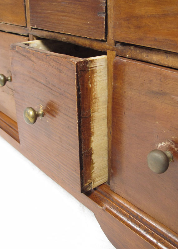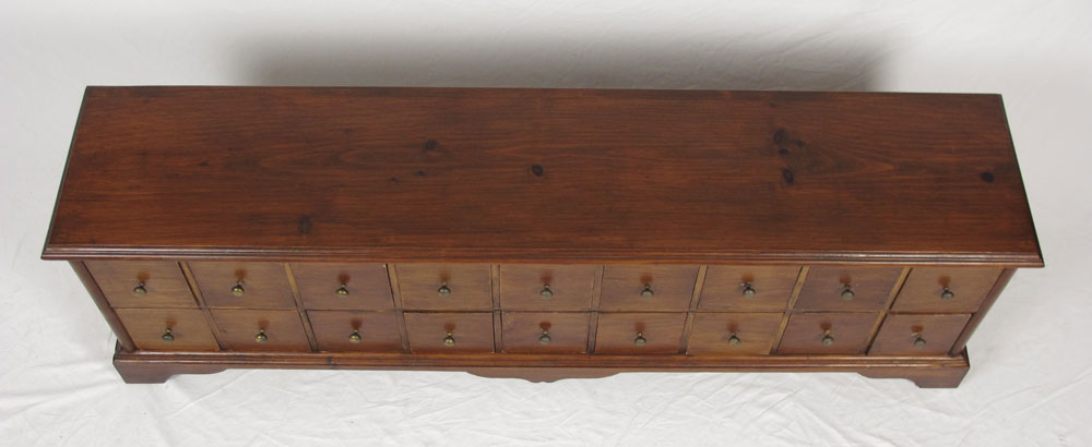APOTHECARY CHEST: 19th C apothecary drawers set into a later custom frame and bracket base. The drawers are dovetail constructed. 18'' tall x 59'' x 13''.