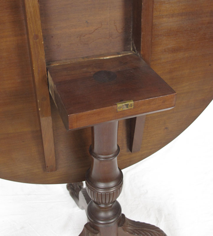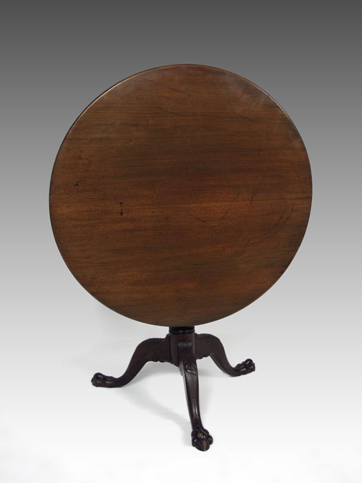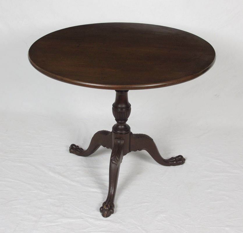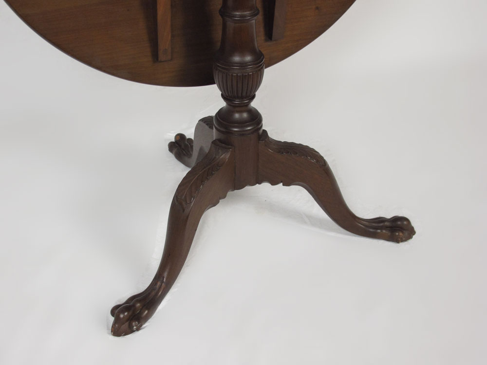CHIPPENDALE STYLE TILT TOP TABLE: Round walnut table, candle platform over single turned pedestal with ribbed urn center on tri legged base, ball and claw feet, acanthus leaf design to knees, 33 3/4'' dia. top, 46 1/2''h. when up, 27 1/2''h. when down.
