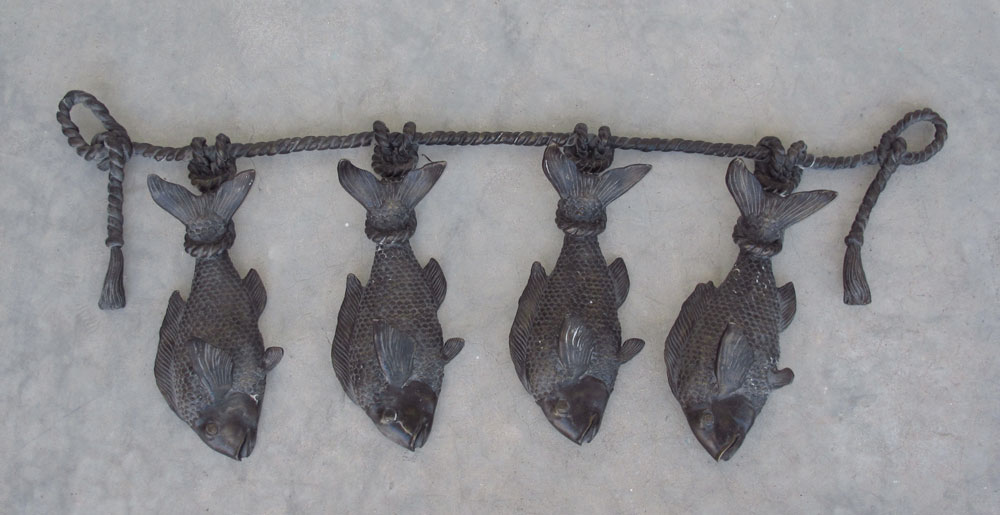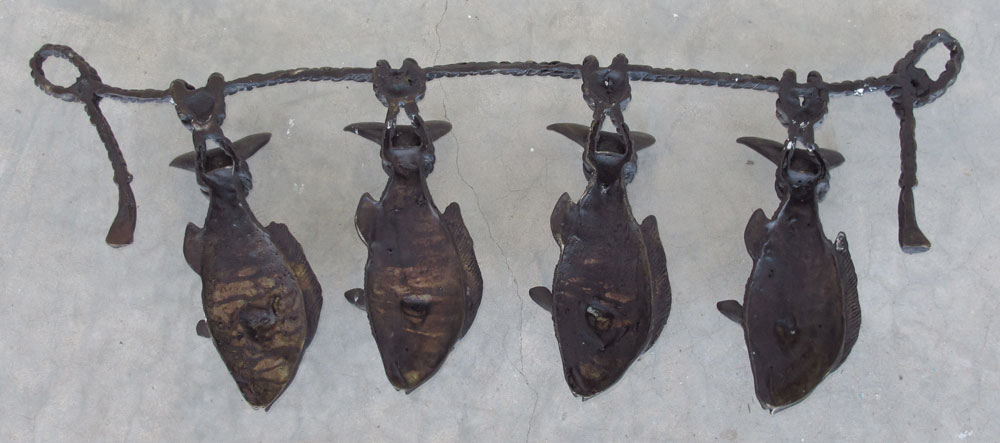 UNIQUE CAST METAL FISH COAT HOOK: Decorative cast metal with 4 fish hanging from rope. 27 3/4'' x 16''.
