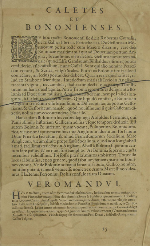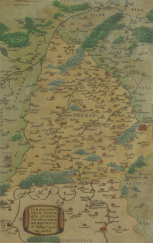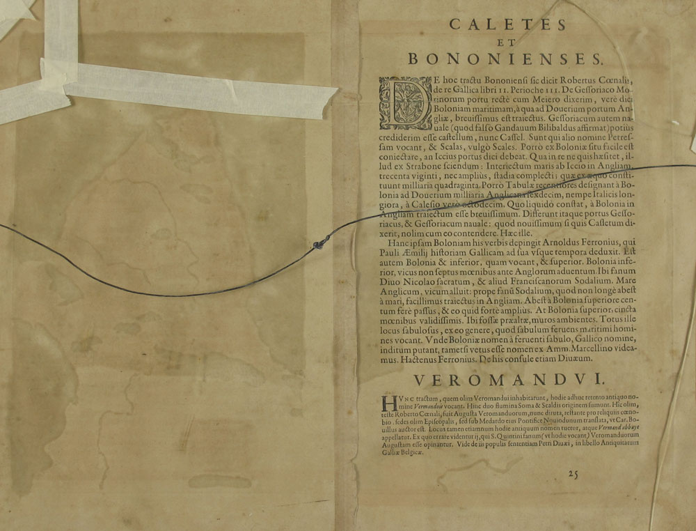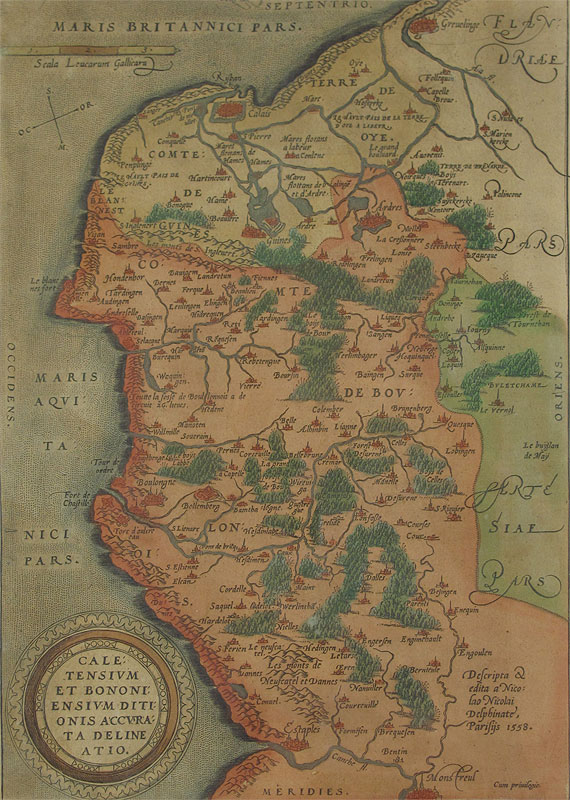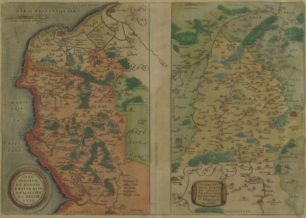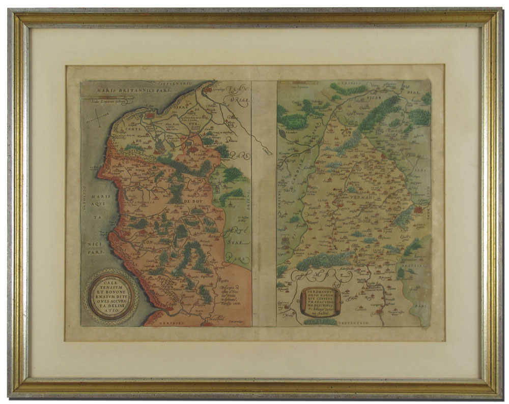 1592 ORTELIUS THEATRUM FRENCH MAP: From the 1592 printing, page 25, double map, one depicting Calais and Boulogne by Nicolaus Nicolai Delphinate dated 1558, the other depicting Vermandois and its borders by Johannnes Surhonius. Both maps on one plate, hand colored. From an edition size of 525 copies. Sight size 14 1/2'' x 20 1/4'', framed with glass on both sides so one can read the text, 20 1/2'' x 26 1/4''.