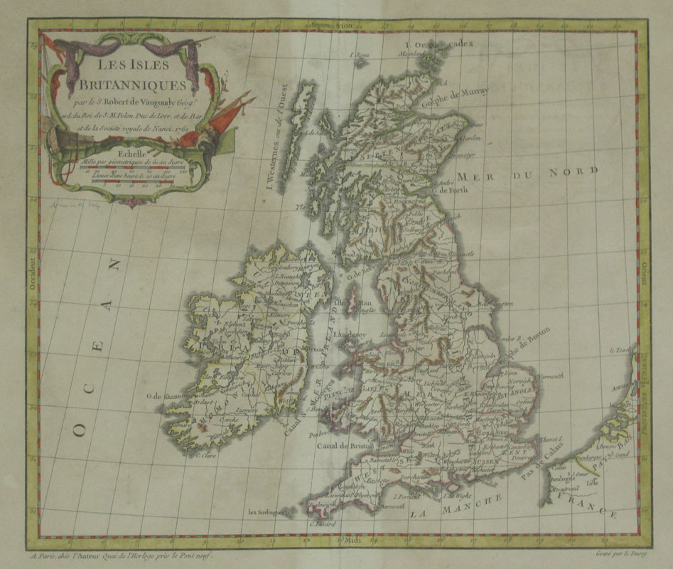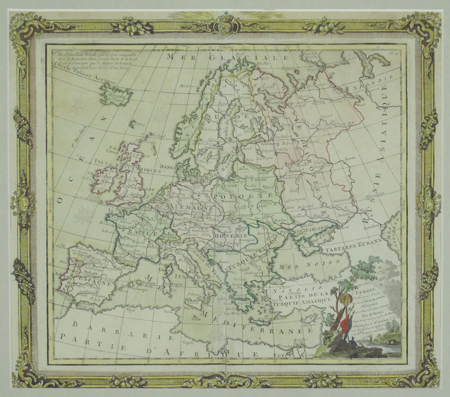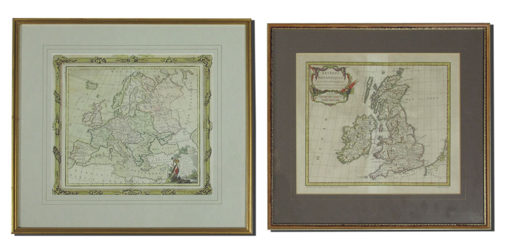 2 PIECE 18TH CENTURY EUROPEAN MAPS: To include 1) 1766 L' Europe, by M. Brion. Sight size 10 3/4'' x 12 1/4'', framed 16 1/2'' x 18 1/2''. 2) 1762 Les Isles Britanniques, by Robert de Vaugondy. Sight size 10 3/4'' x 12 1/2'', framed 15 3/4'' x 17''.