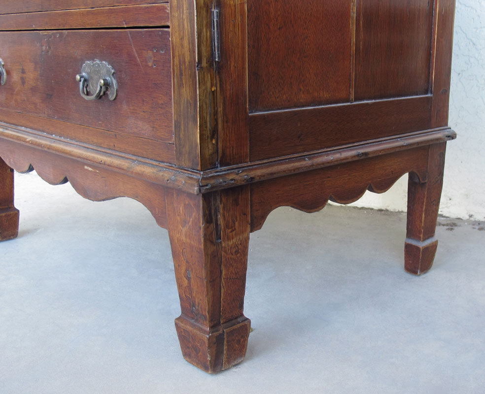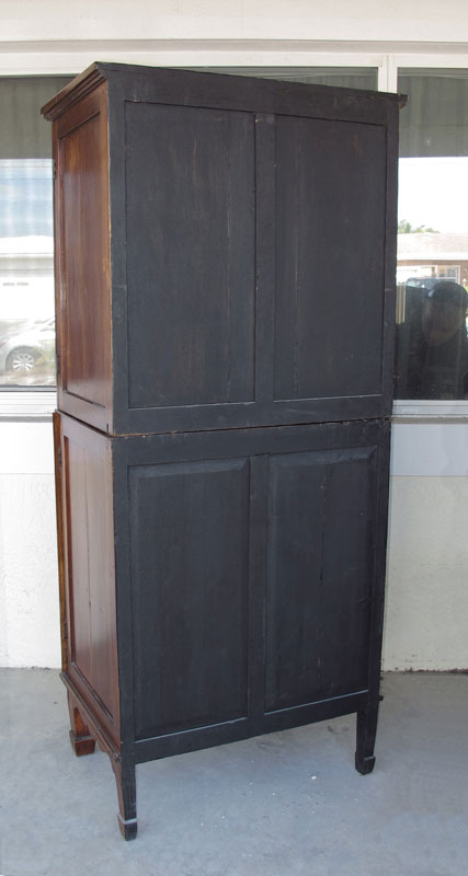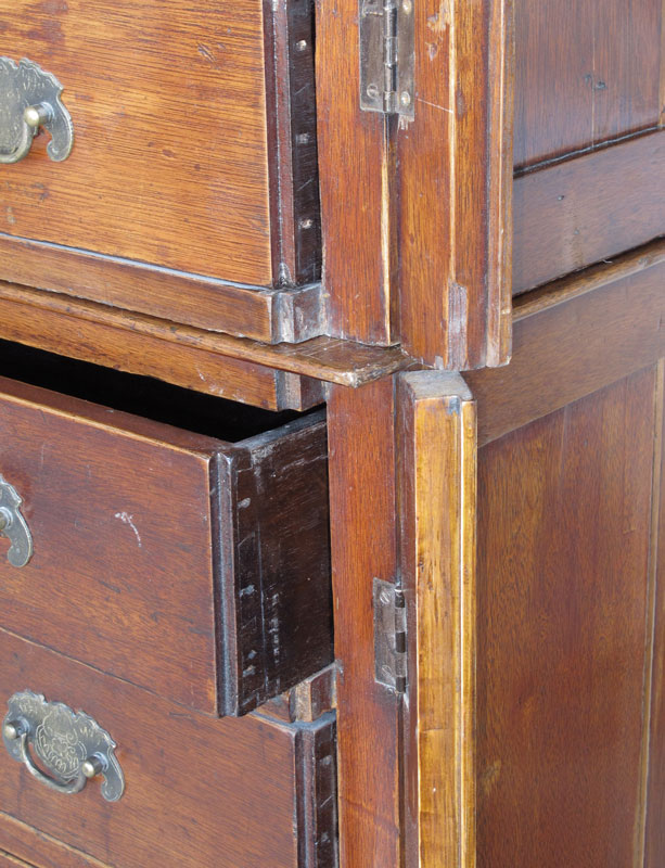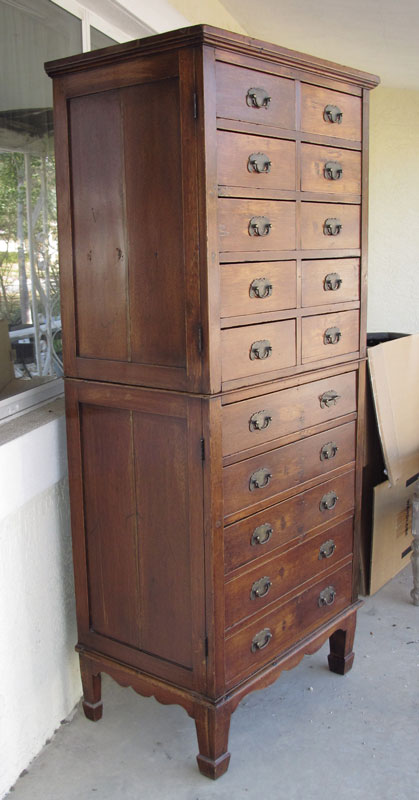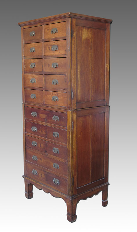 19th CENTURY SIDE LOCK CHEST ON CHEST: Upper section with 10 drawers, edged with hinged side locks. Base with 5 full length drawers, also with hinged side locks. Original brass pulls and square block foot. Top section 32'' h. x 32'' x 21'', bottom 41'' x 32'' x 21'', 73'' h. overall.