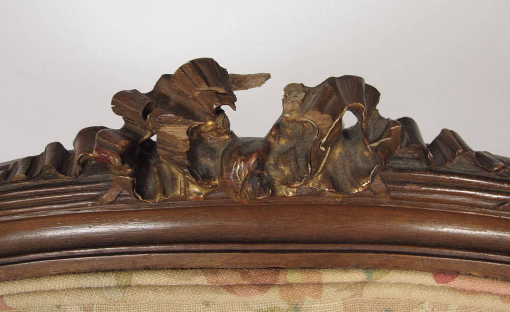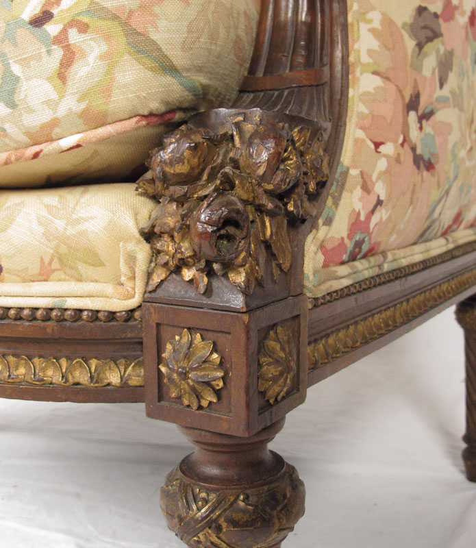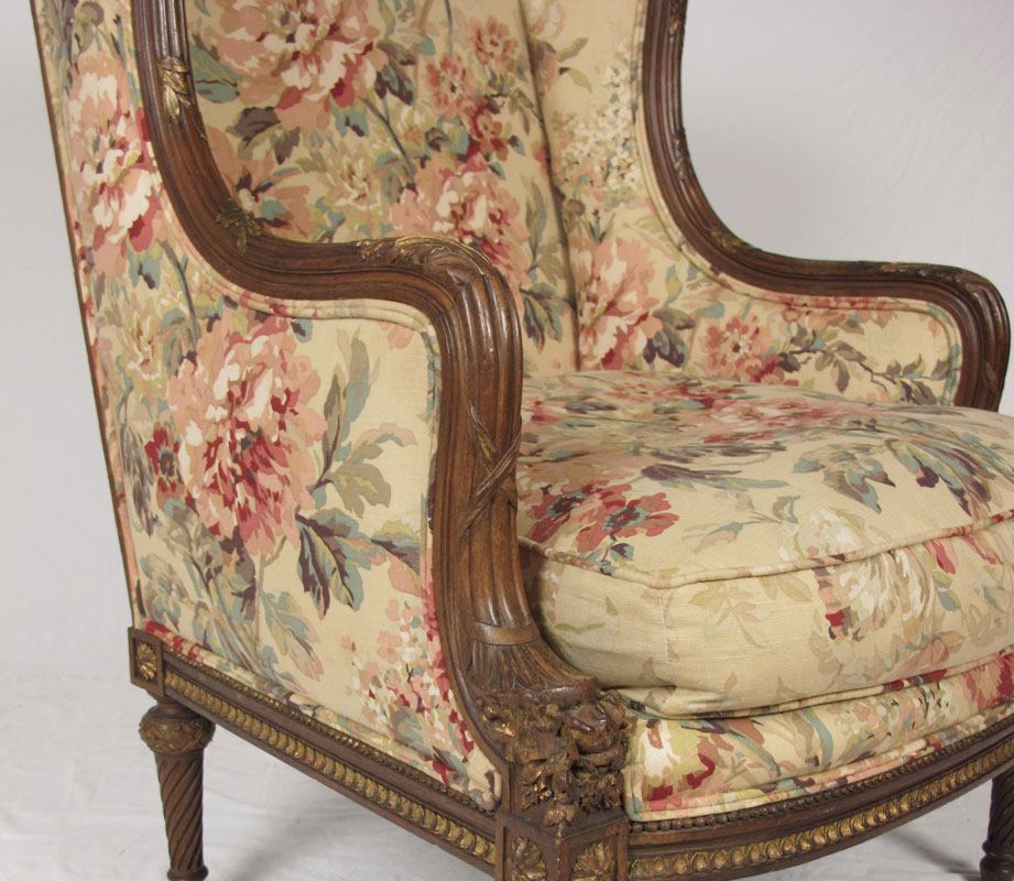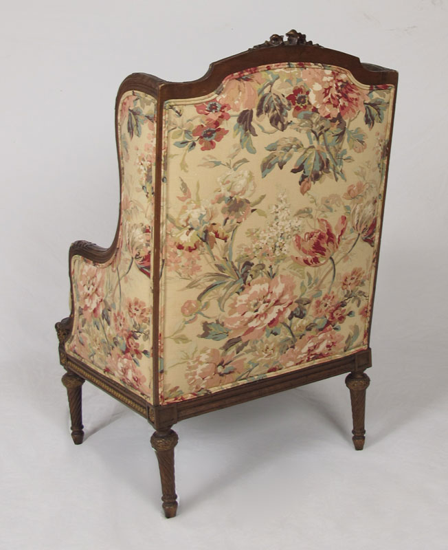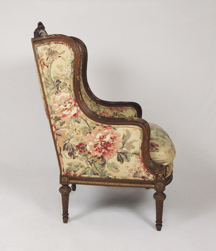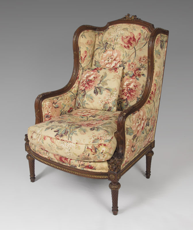 19TH CENTURY FRENCH CARVED WING CHAIR: Carved and accented gilt frame with ribbon carved crest. Continuous arm to foot bridged by floral carving ending in twisted leg. Cotton woven floral printed fabric on down cushion. 42'' h. x 29'' x 32''.