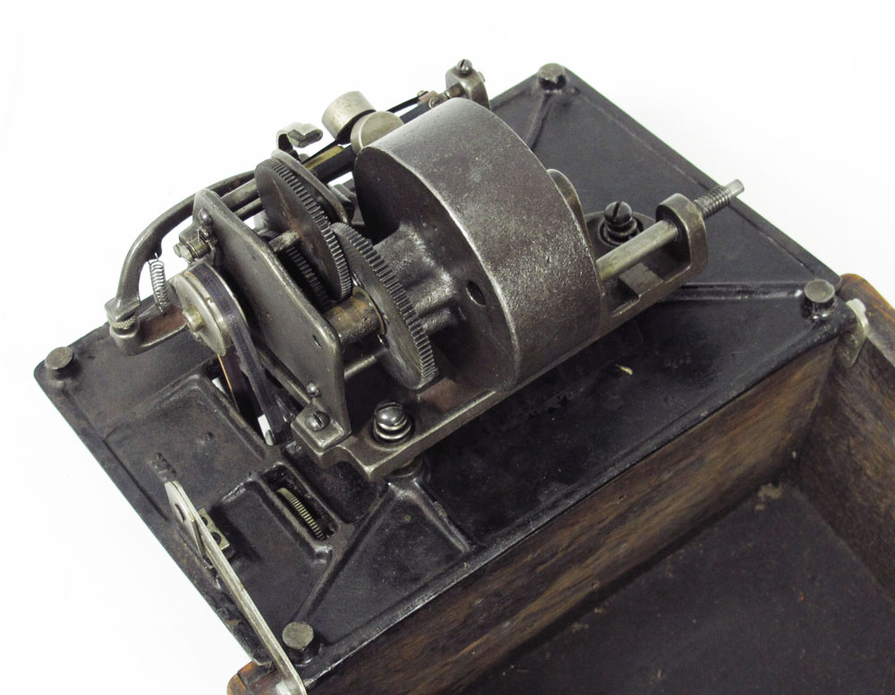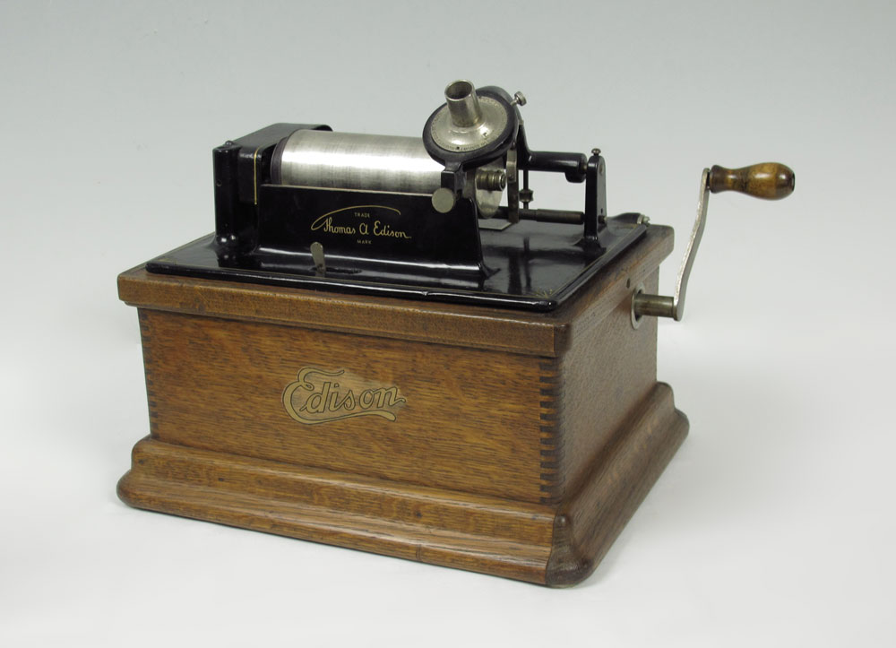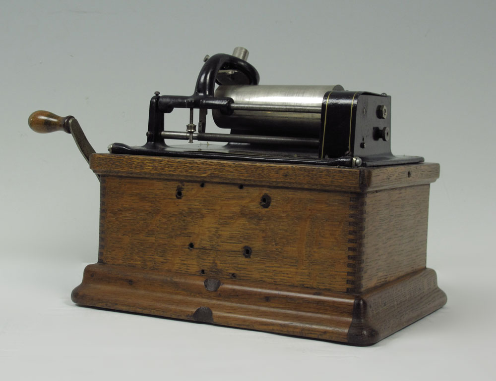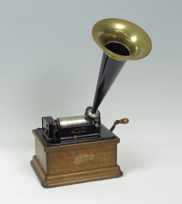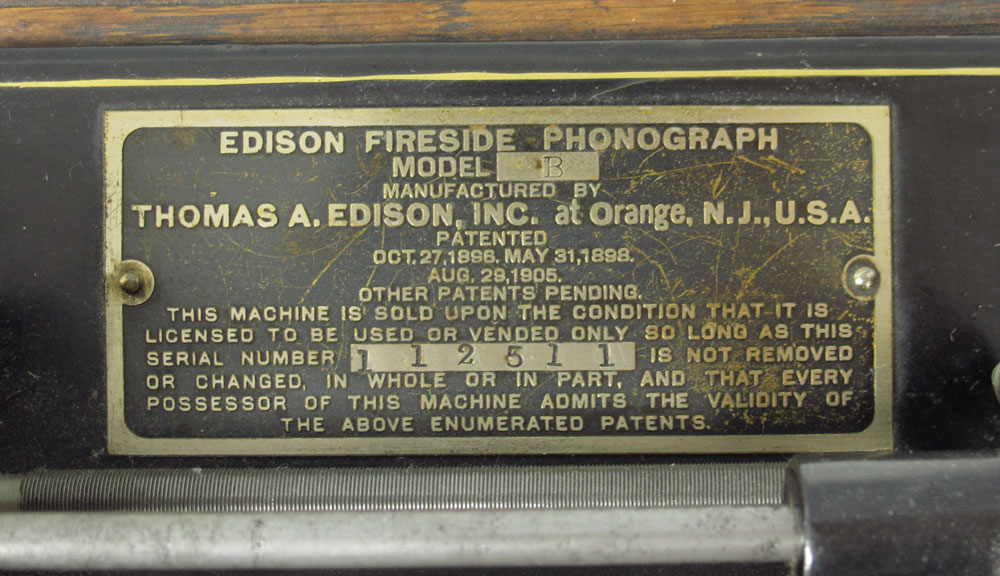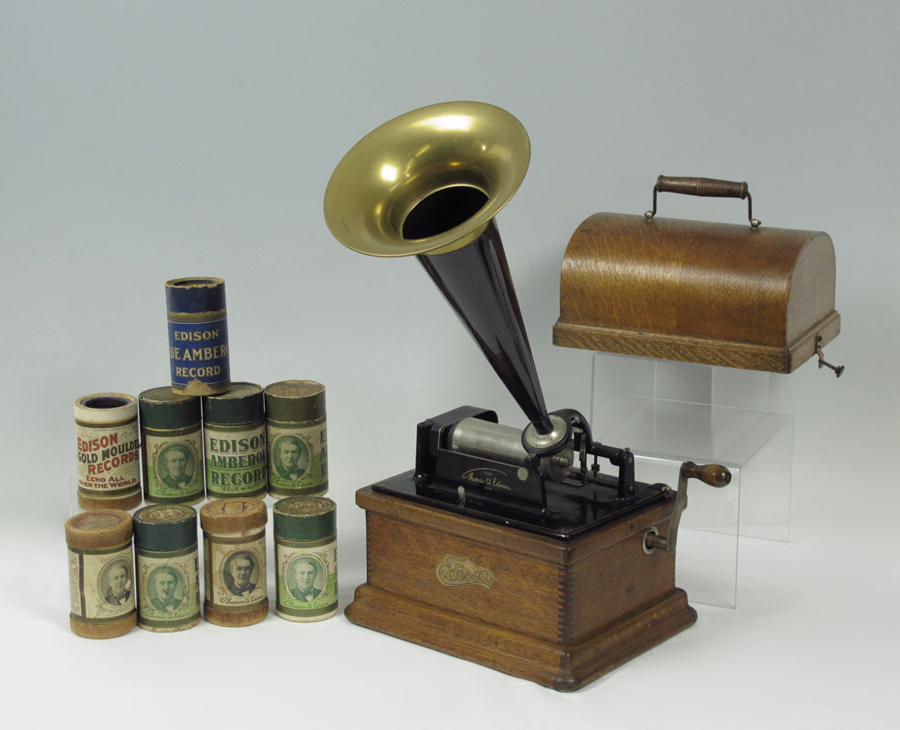 EDISON OAK CASE FIRESIDE ''B'' CYLINDER ROLL: Golden oak case with original Edison label. Serial number 112511. Currently cranks and rolls fine. 11 1/4'' h. x 11 5/8'' x 9''. Sold with original horn 13 5/8'' x 7 1/4''. Sold with 9 cylinders.