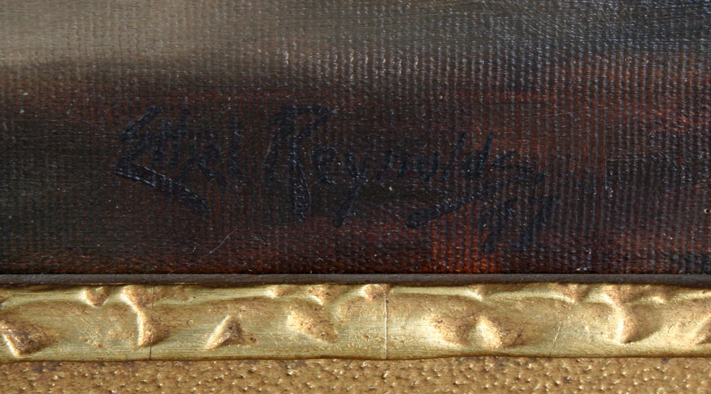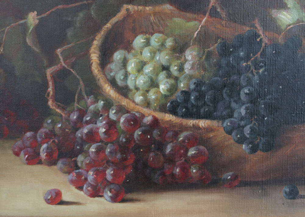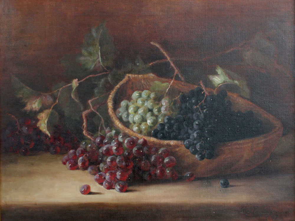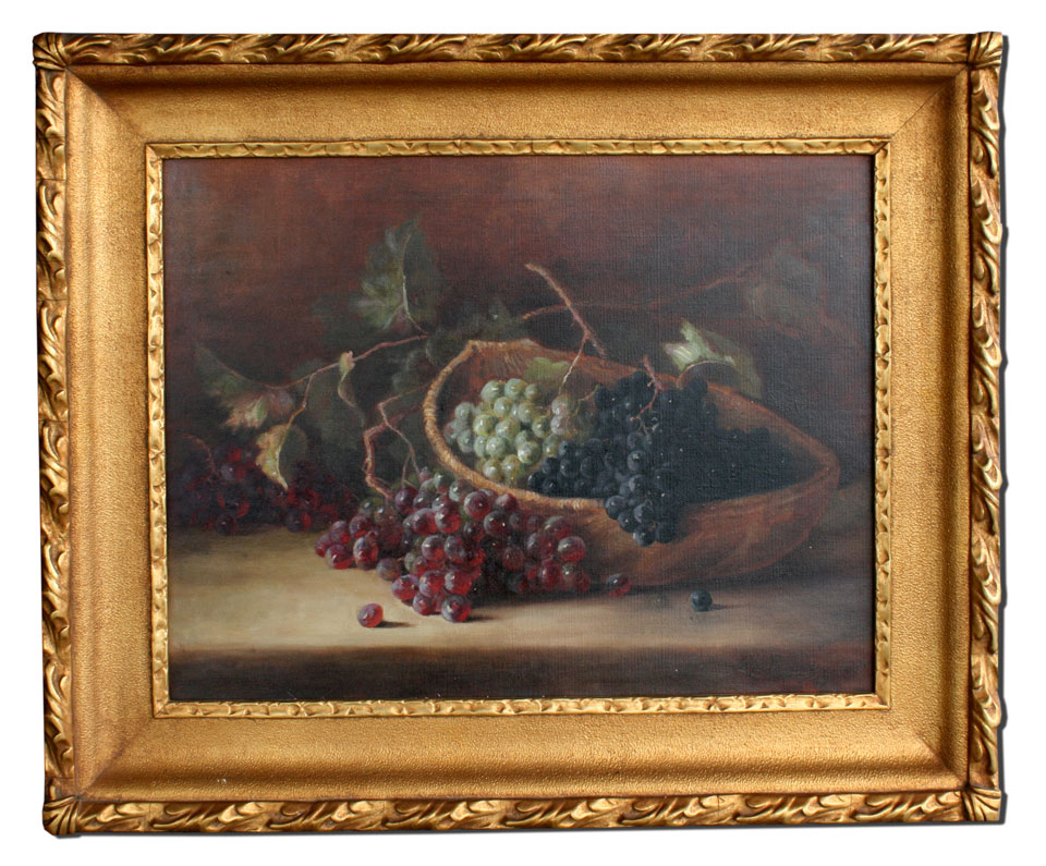 REYNOLDS, Ethel, (American, 20th C.): Still Life of Grapes in a Basket, OIL/Canvas, 18 1/4'' x 24 1/4'', original carved and gilded frame with minor wear, 25''x 32''.