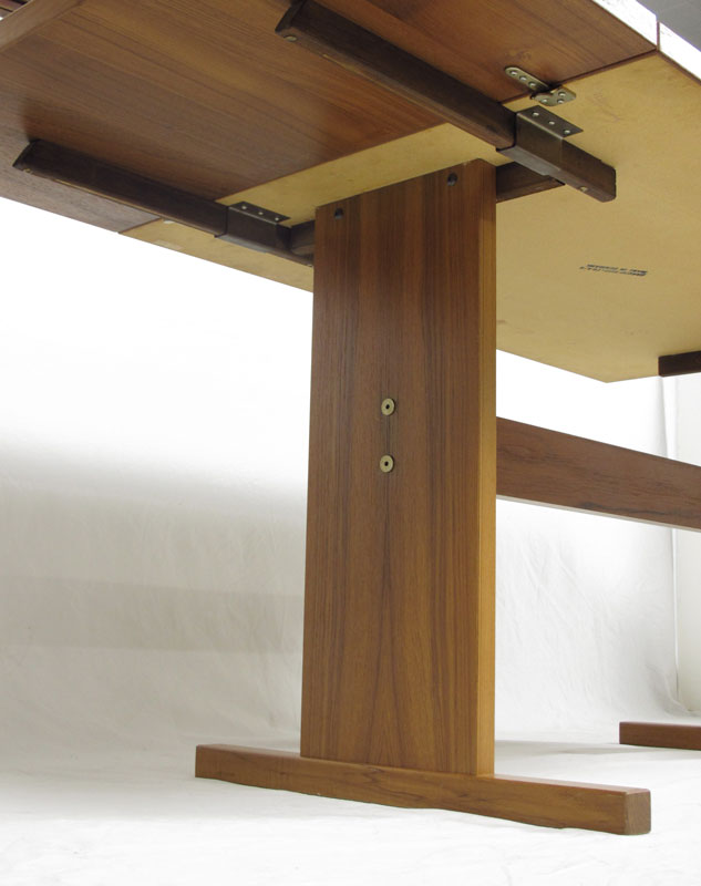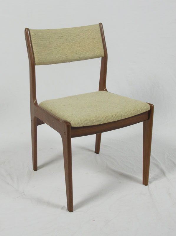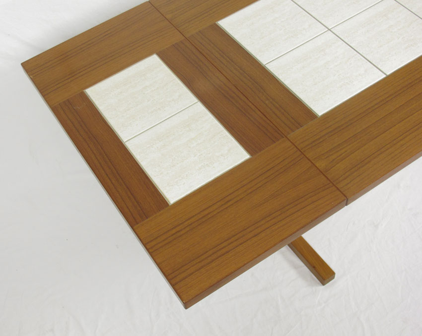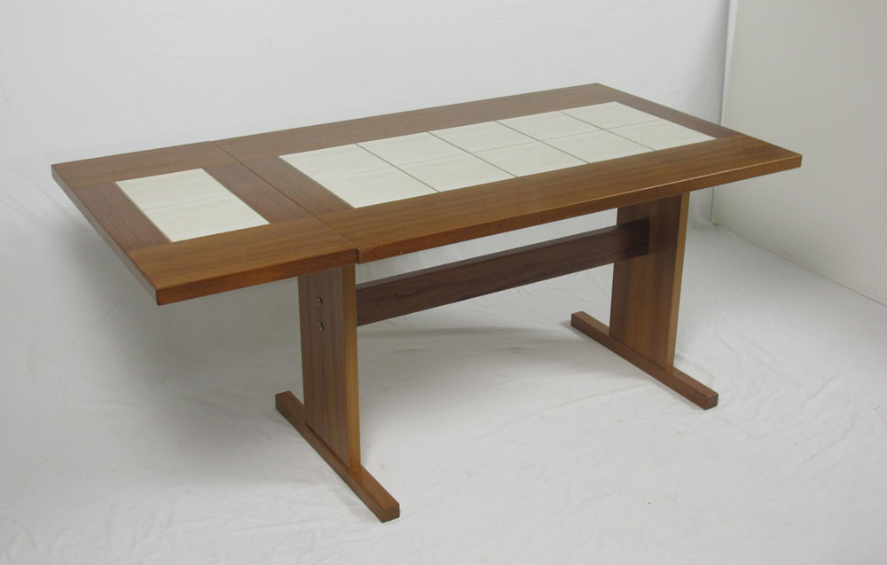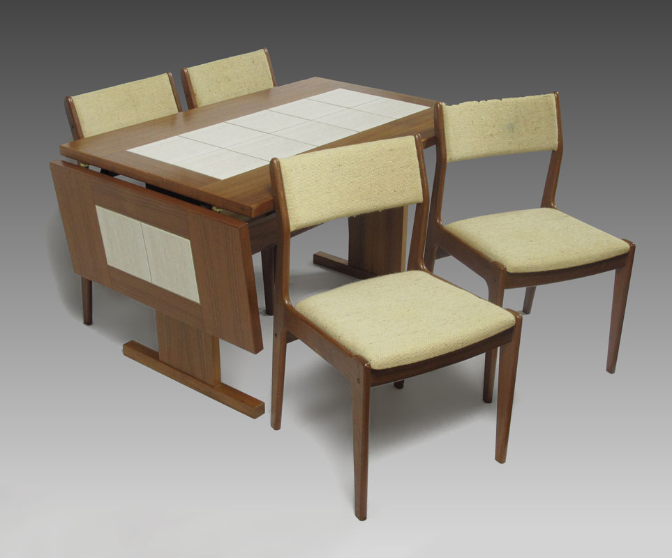 GANGSO MOBLER DANISH MODERN TABLE AND CHAIRS: The table with tiles down the center and drop leaf at one end. The chairs are Scandinavian Woodworks.