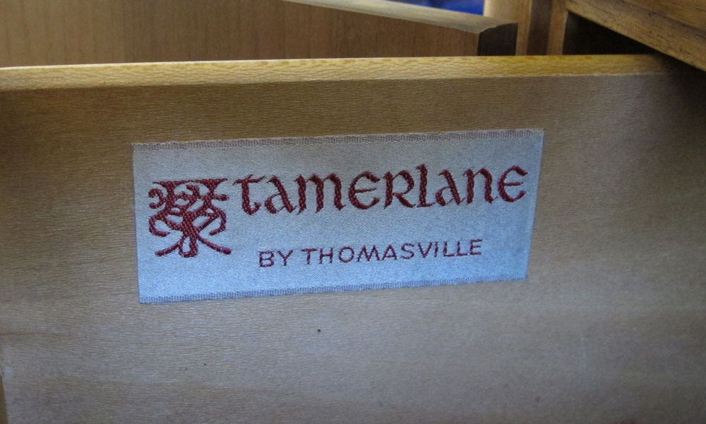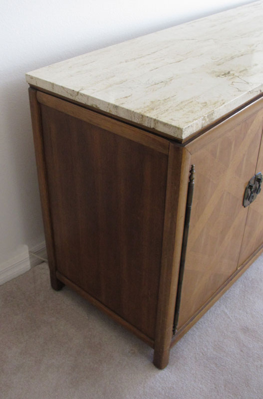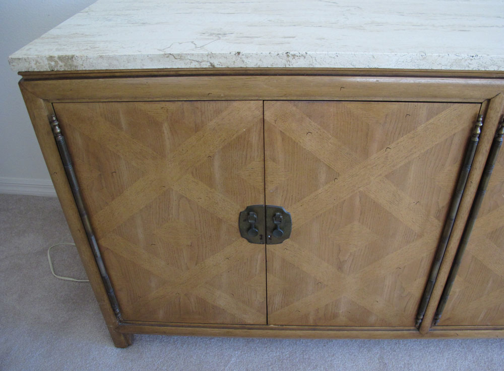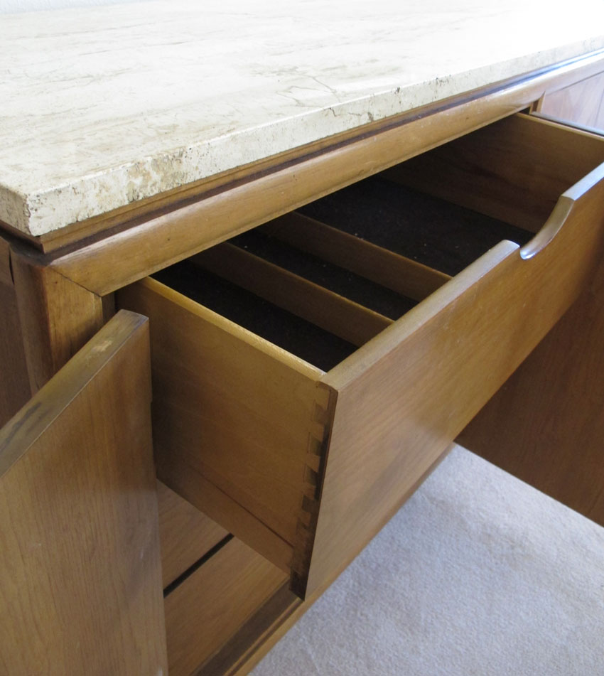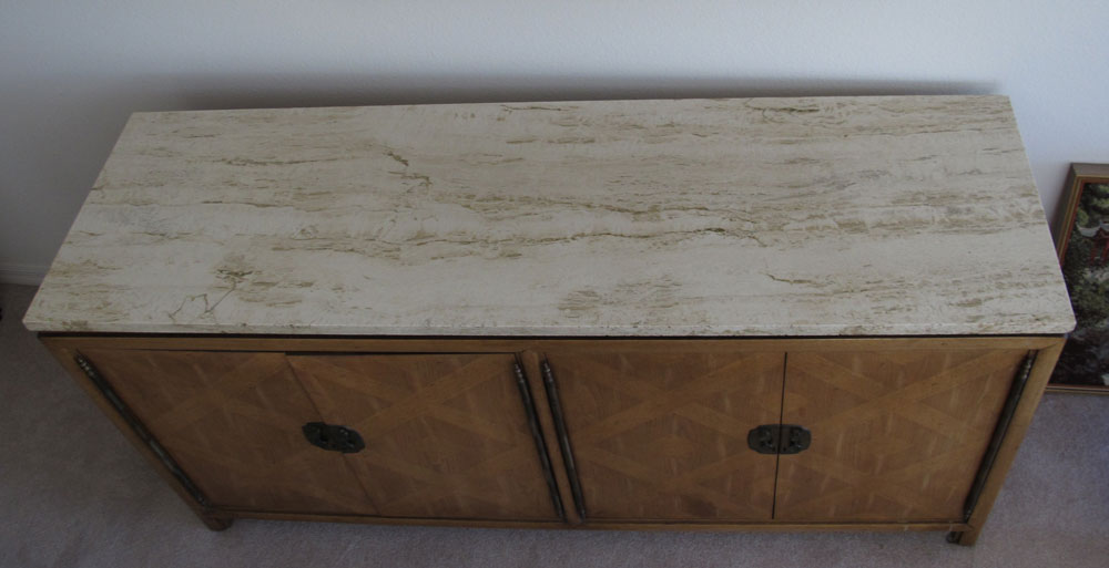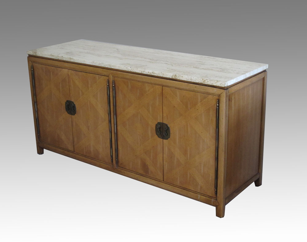THOMASVILLE MID CENTURY MARBLE TOP CREDENZA: Variegated white marble top. 4 door base with single shelf one side, 3 drawers other side. 32'' h. x 63 1/2'' x 20''.