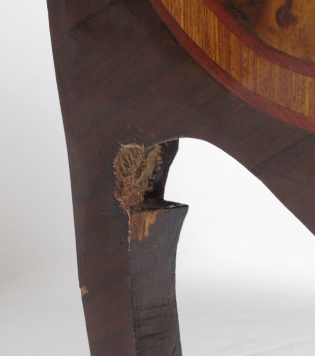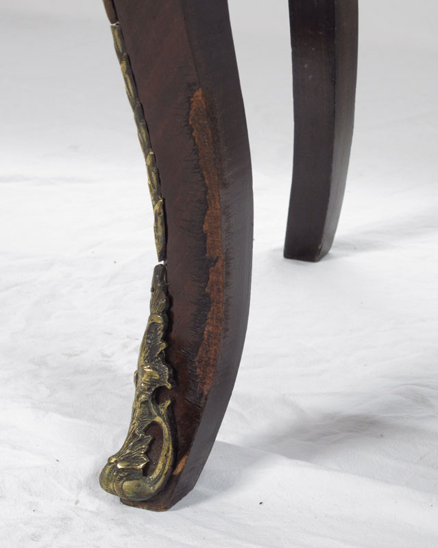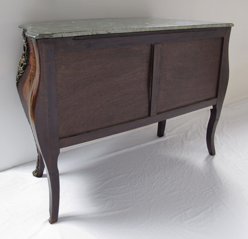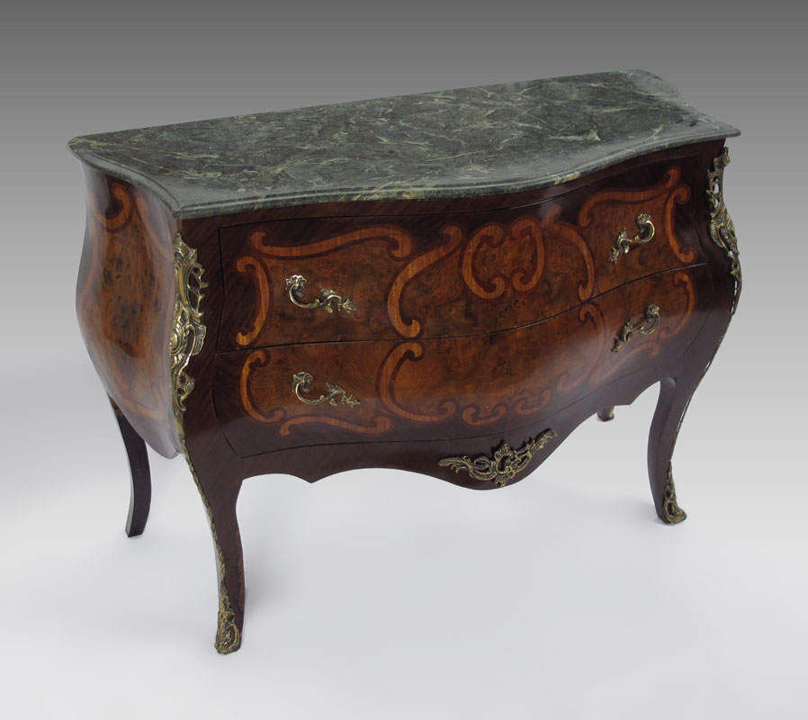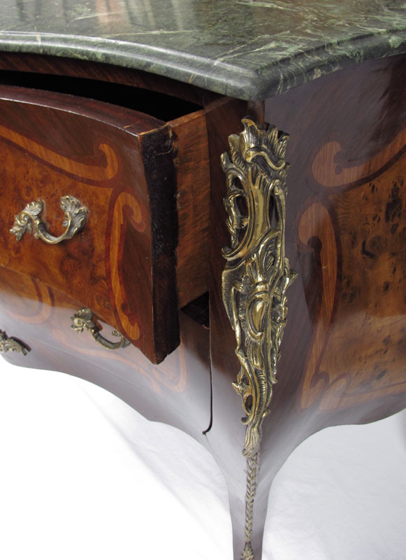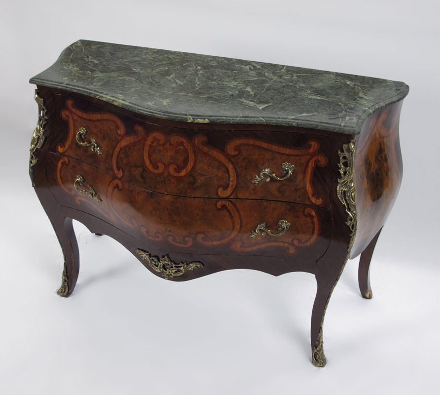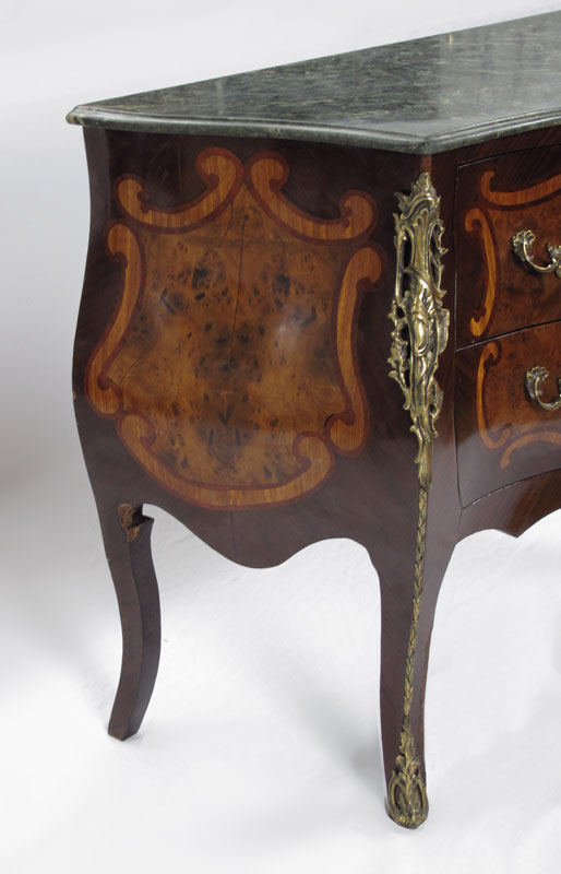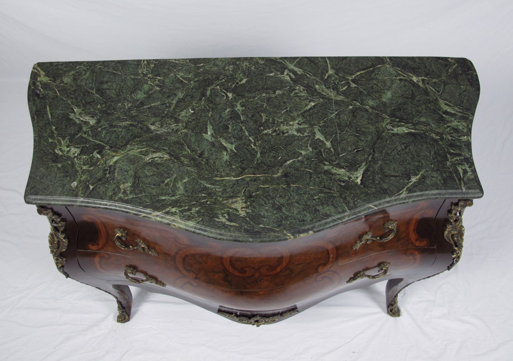 MARBLE TOP FRENCH STYLE COMMODE: Green marble top over Bombay, marquetry inlay, 2 drawer chest. Ormolu mounted. The front leg does have pet chew marks. Measures 32 1/2''h. x 48'' wide x 22'' deep.