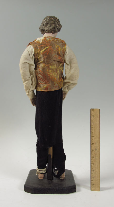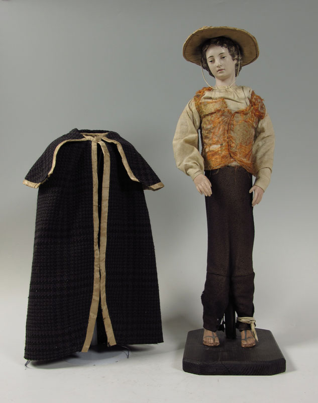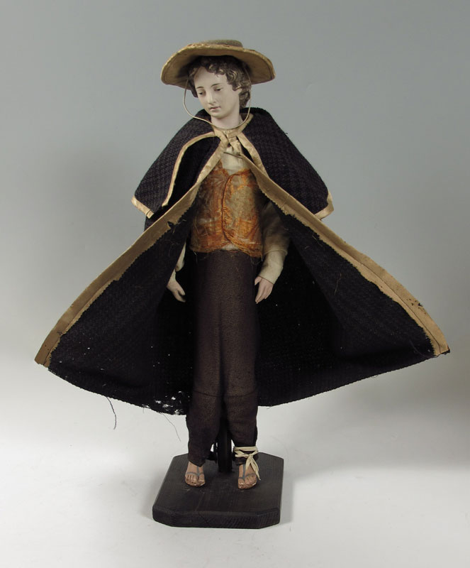 FRENCH WOOD DOLL OR POSSIBLY CRECHE FIGURE: Ceramic head with composition hands and feet. Fragmented silk brocade vest and hand made silk and wool hat. Comes with removable cloak. 27 1/2'' h. x 8'' x 9 1/2''.