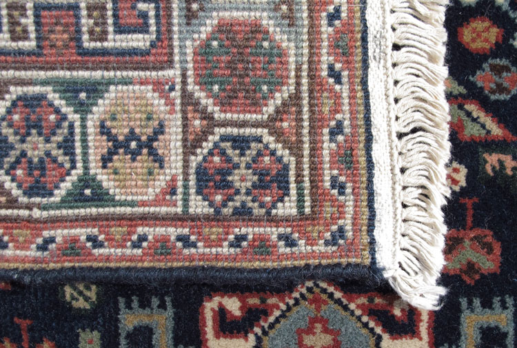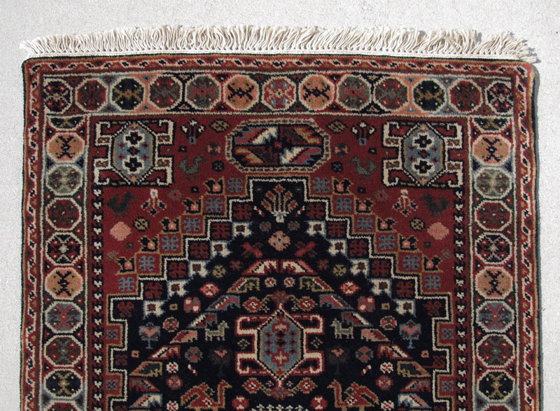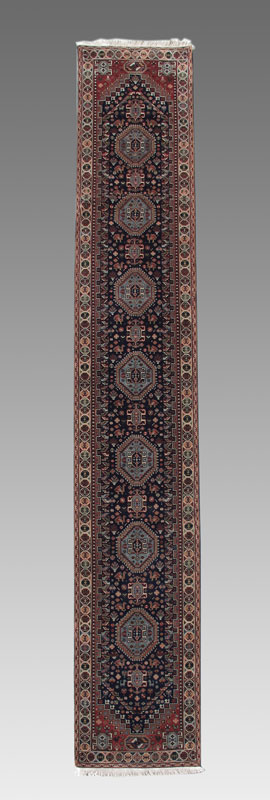 MODERN PERSIAN HAND KNOTTED WOOL RUNNER, 2' 6'' x 13' 8'': This long runner has a deep blue field that is filled with rows of alternating shape and size medallions that are mainly a light blue bordered by peach, rust orange, and ivory edged by a latch hook motif. In the rest of the field are lots of small flower heads and small bird figures as well. The border of the main field has a stepped design that does a great job of framing the field, and beyond that the main border has round motifs that look like a string of many colored beads. Condition is very good.