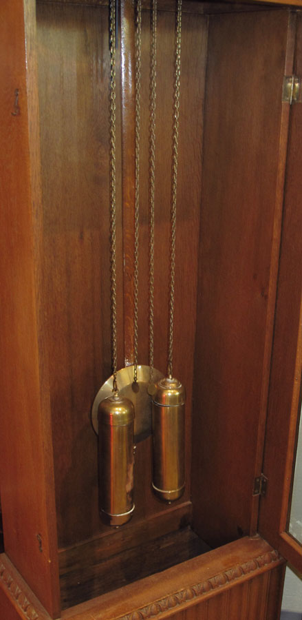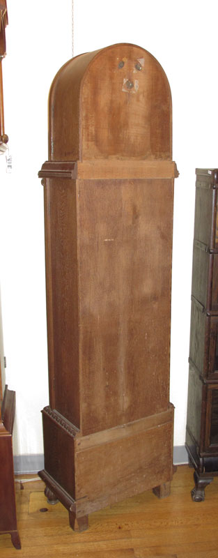 GERMAN DECO LONGCASE CLOCK: 1930's era with carved and applied decoration including half columns. Silvered dial. 77 1/2'' h. x 22'' x 12 1/2''.