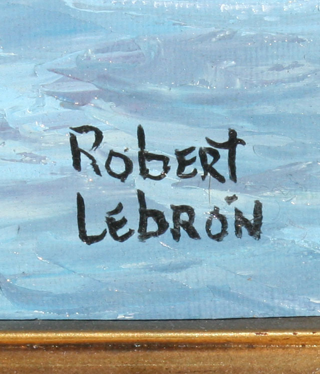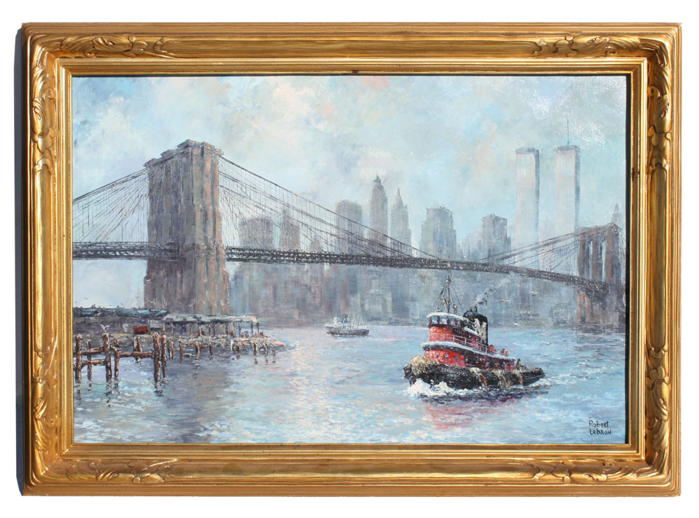 LEBRON, Robert, (American, 20th C.): New York City Harbor Scene with Brooklyn Bridge and Tug Boat, Oil/Canvas, 24'' x 36'', signed, gilded frame, 30 1/2'' x 40 1/2''.