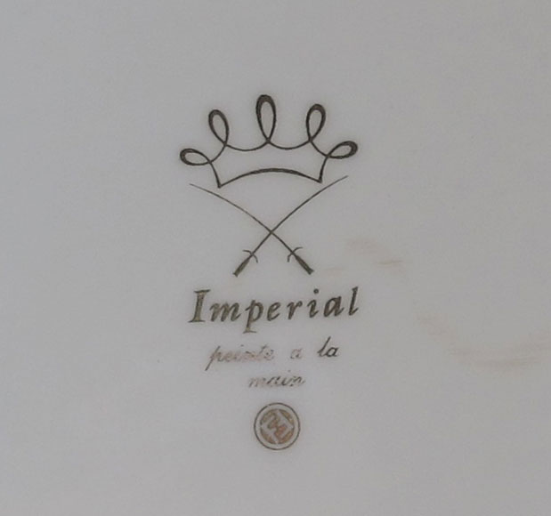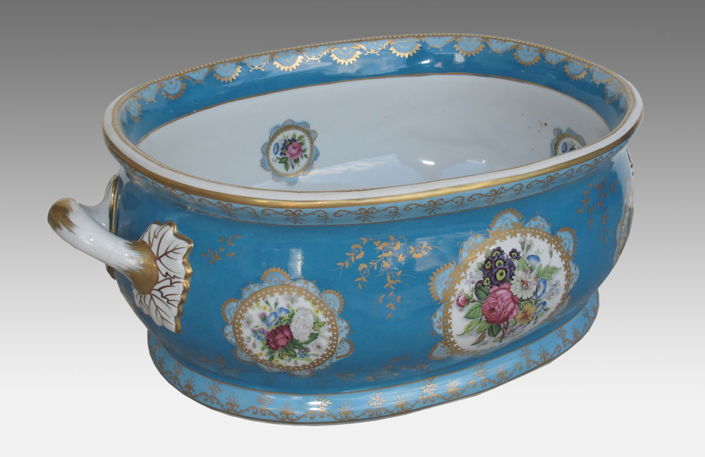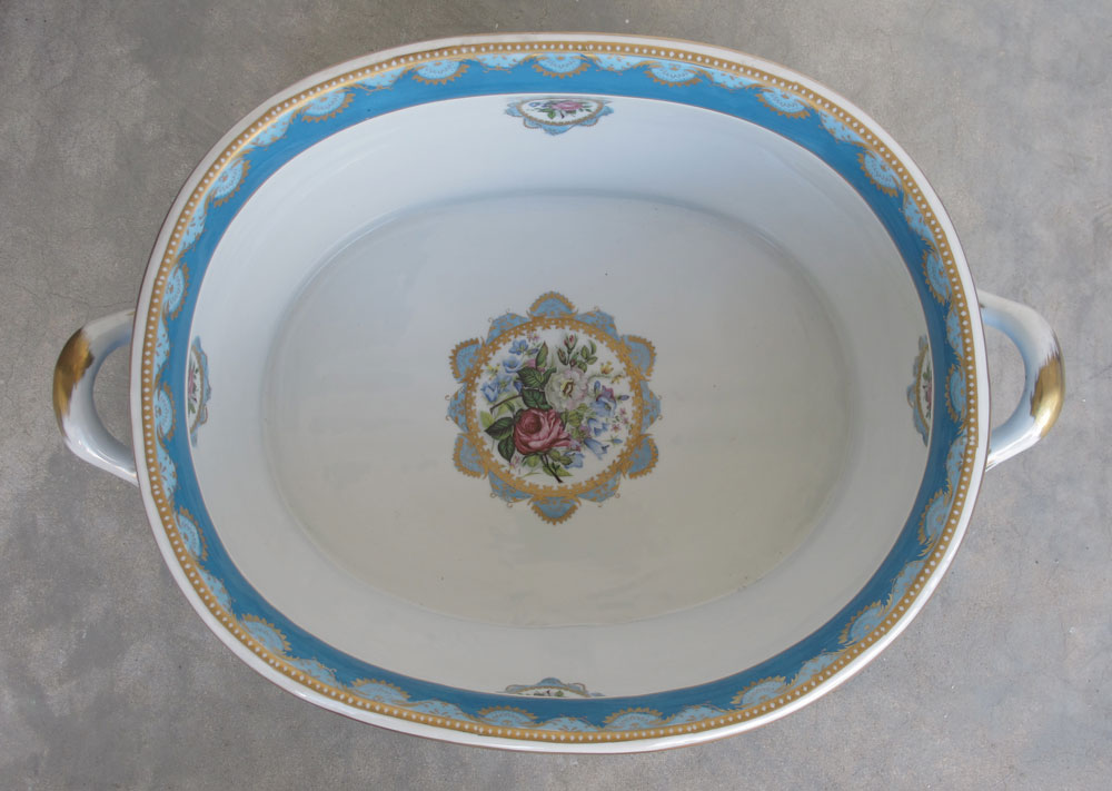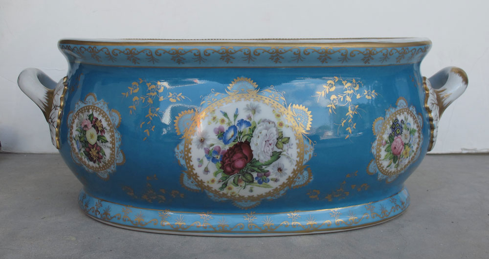 LARGE IMPERIAL FOOT BATH HANDLED BOWL: 20th century transfer floral design and gold decoration. Marked Imperial Peinte a la Main. 8'' h x 22'' x 15''.