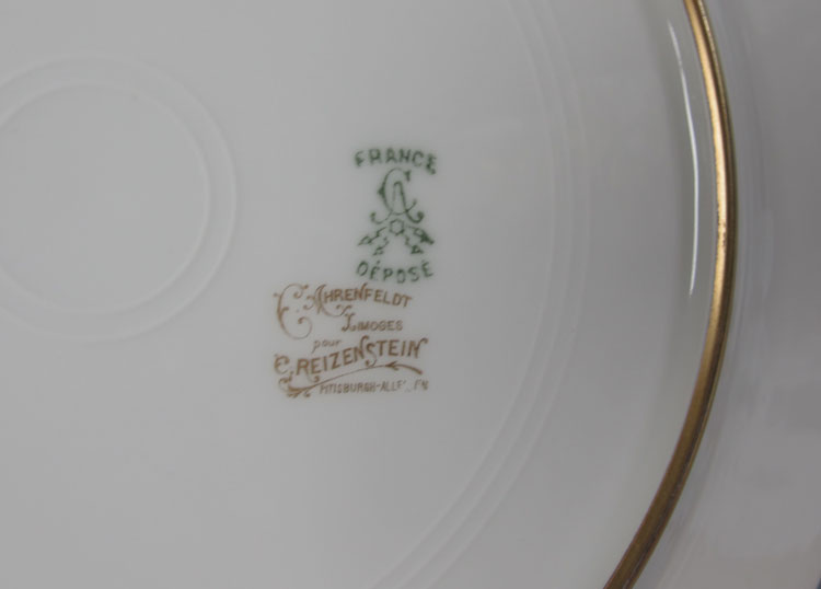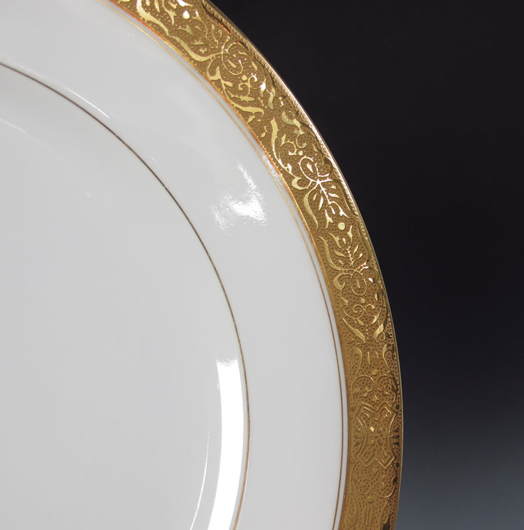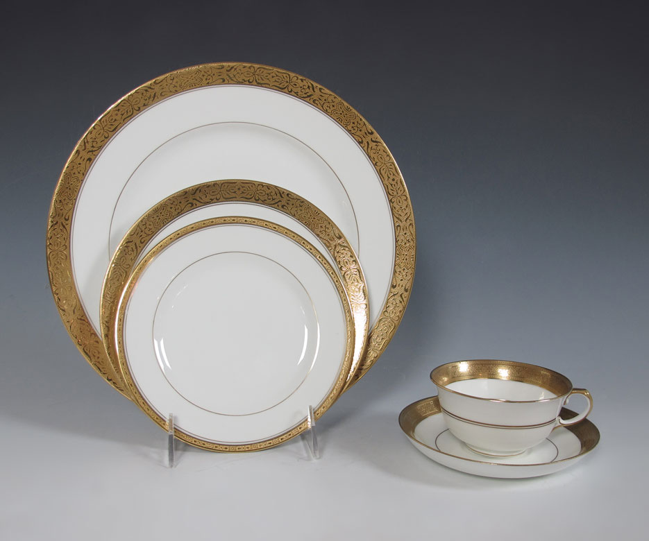 FRENCH LIMOGES AND MINTON GOLD RIM CHINA: Charles Ahrenfeldt Limgoes embossed gold china plates, 10 each of dinner, salad, and bread plates. Sold together with 10 embossed gold rim Minton cups and saucers.
