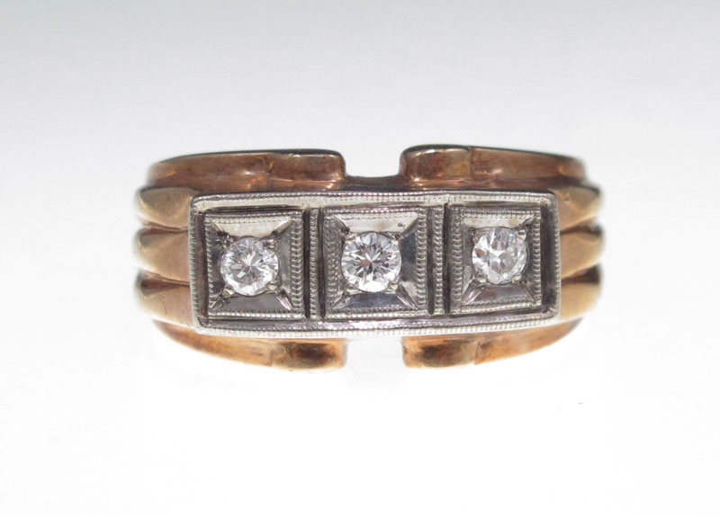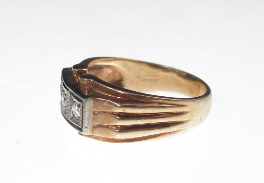 GENTS 14K GOLD & DIAMOND RING CA. 1940'S: Three round full cut diamonds, approx. .30 Ctw., rated VS in clarity and G-H in color The diamonds are prong set. Weight: 9.2 grams. Size: 11.5.