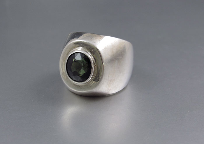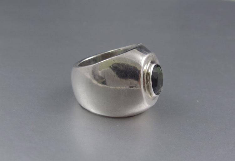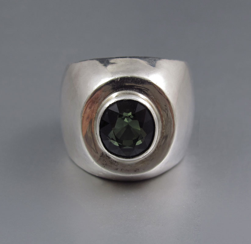 CUSTOM 4.93 CT TOURMALINE RING: Sterling ring contains one oval shaped mixed cut tourmaline. Weight: 4.93 Ct. Approx. Rated VS in clarity (Type II), G in Hue, 7 in Tone and 2-3 in Saturation. The tourmaline is bezel set. Weight: 27.7 grams. Size: 9