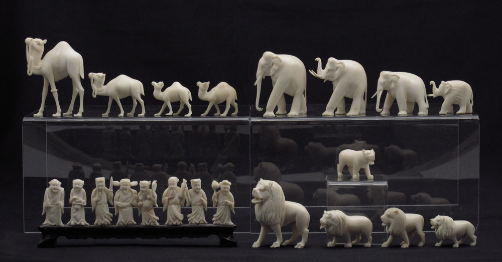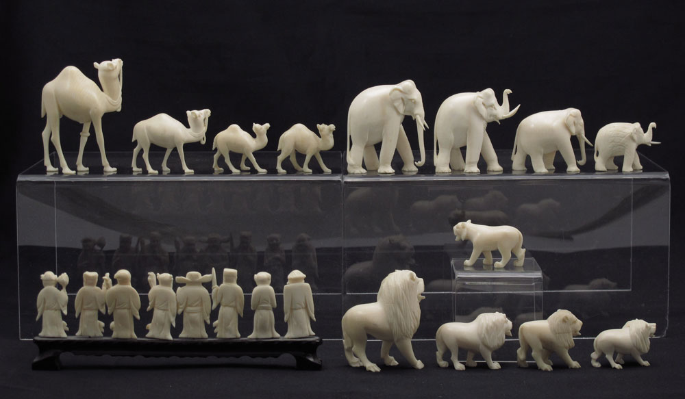 14 PC CARVED IVORY MENAGERIE: To include elephants, lions, camels and the 8 Chinese immortals. Largest elephant 2 1/4'' h., immortals affixed to stand 2 1/4'' h. x 6 1/2'' l..