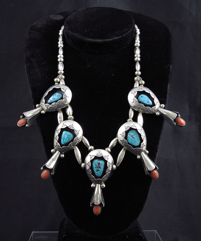 SIGNED TURQUOISE AND CORAL SILVER SQUASH BLOSSOM NECKLACE: Signed TG Native American necklace, either Tony Garcia or Timothy Guerro. 5 shadowbox blossoms of equal size, 2 1/2''l. Entire necklace measures 18''l. Weight overall: 3.325 troy oz.