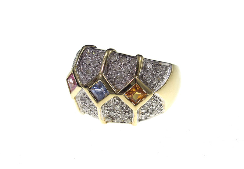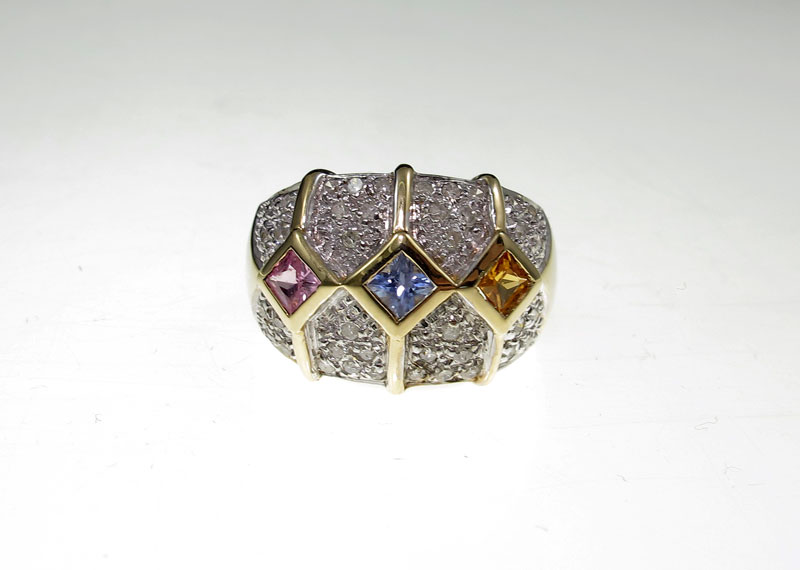 14K SAPPHIRE & DIAMOND RING: 14K yellow gold ring contains three square mixed cut sapphires. Weight: 1.00 Ct. Approx. Rated VS in clarity (Type II), stpR, bV and oY in Hue, 3-4 in Tone and 3 in Saturation. Forty tow round full cut diamonds. Weight: .40 Ct. Approx. Rated I1-I2 in clarity and I-J in color. The sapphires are bezel set. the diamonds are pave set. Weight: 7.5 grams. Size: 7.5
