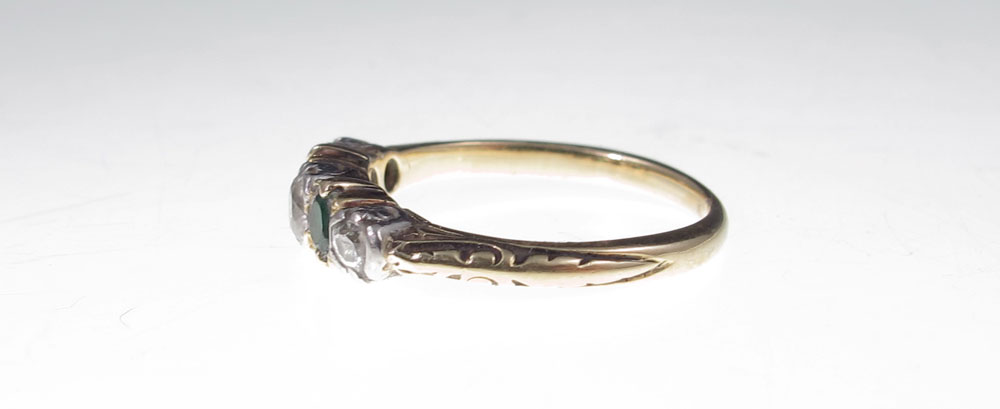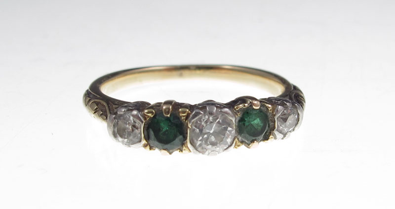 14K DIAMOND BAND RING CA. 1920s: 14K yellow gold ring contains three old European round cut diamonds. Weight: .33 Ct. Approx. Rated VS in clarity and H-I in color. Two 2.50 mm green stones of unknown origin. The stones are prong set. Chased shoulders. Weight: 3.0 grams. Size: 6