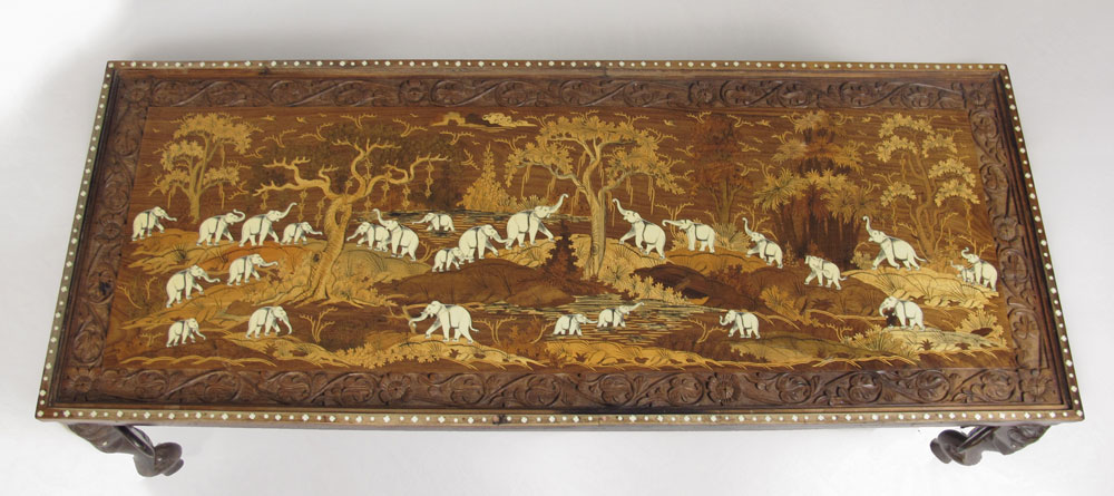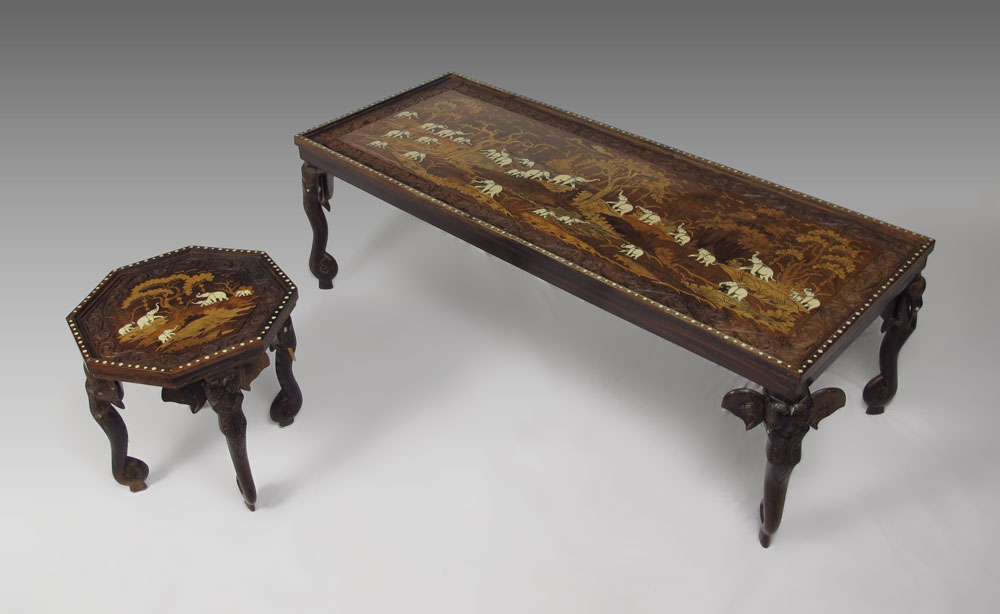 INLAID FIGURAL ELEPHANT COFFEE & SIDE TABLE: To include 1) Coffee table with scene of elephants in a forest with bone and wood inlay, carved wood border. 4 figural elephant head legs. Glass top. 19 1/4'' h. x 64'' x 25''. 2) Matching side table, missing glass top. 17 1/2'' h. x 19 1/2''.