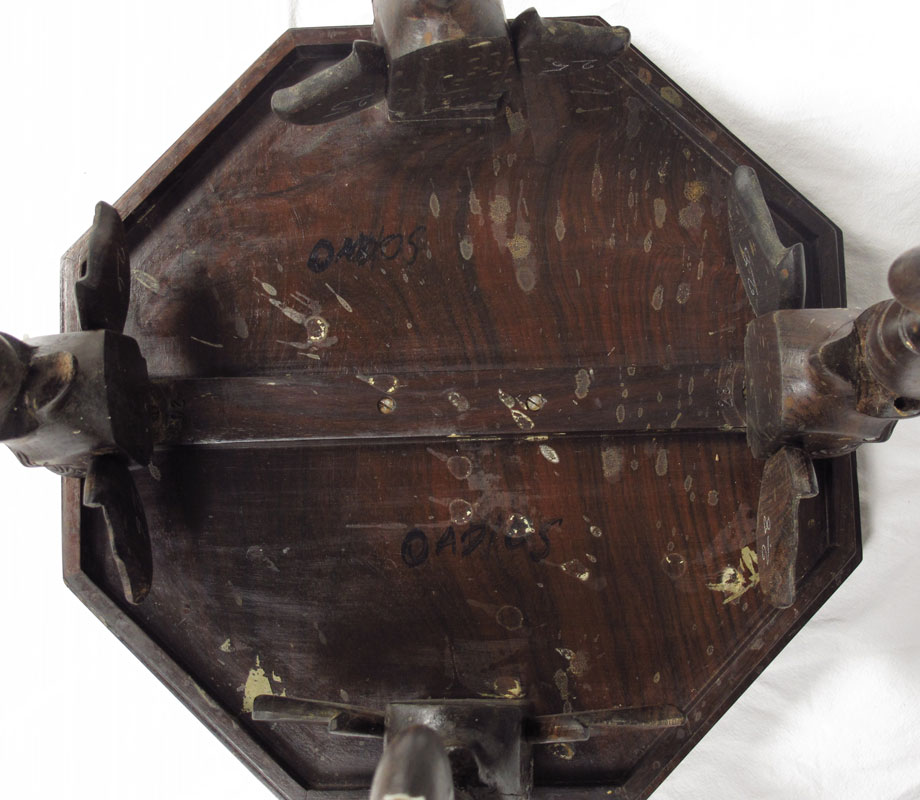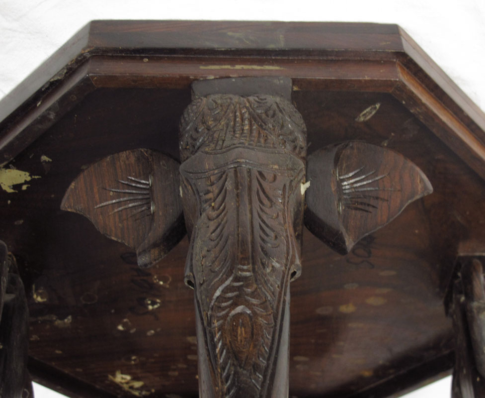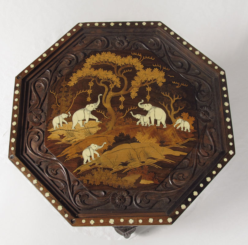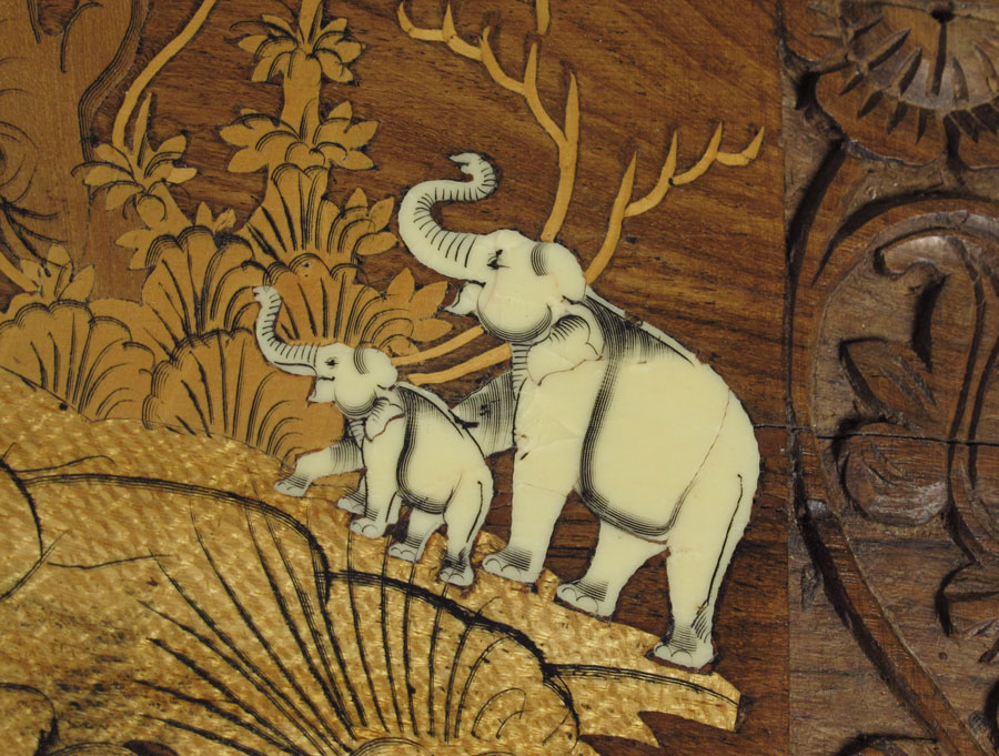 CONDITION: Note missing tusks on legs, signs of wear to finish on legs, several small pieces of missing inlay.