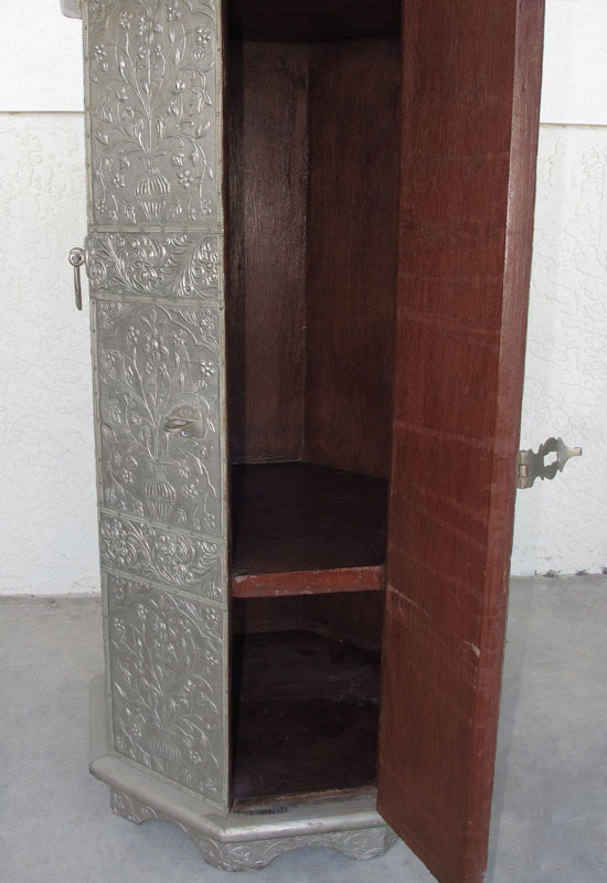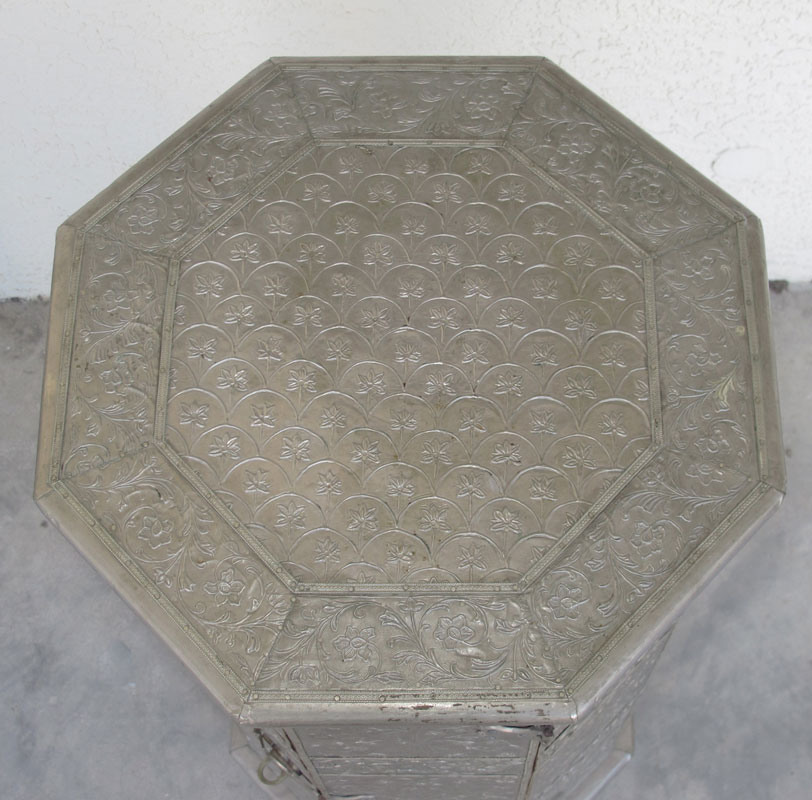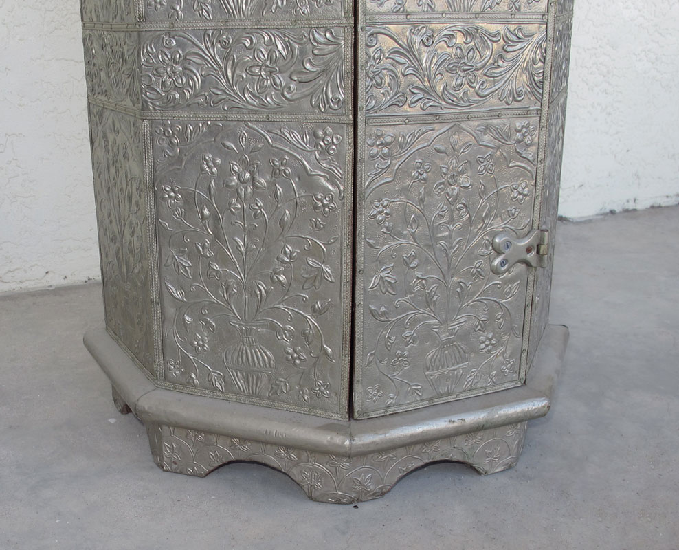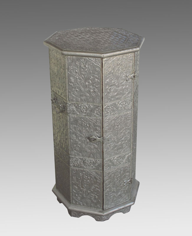 DECORATIVE OCTAGONAL METAL CLADDED STAND: Shelved interior. 32''h x 17''.