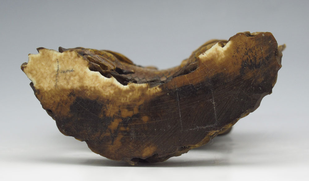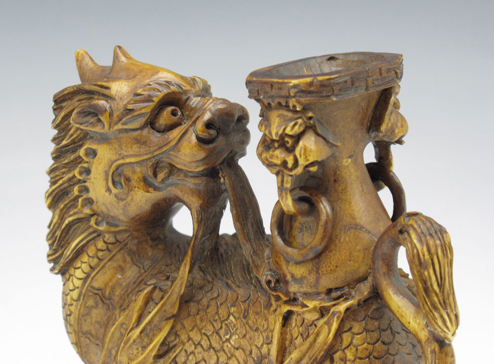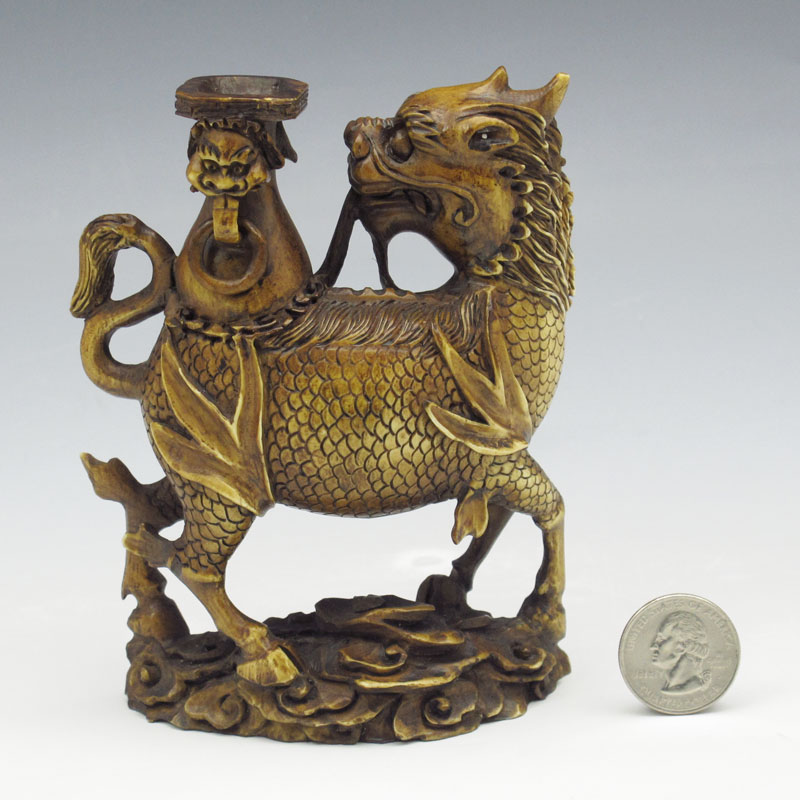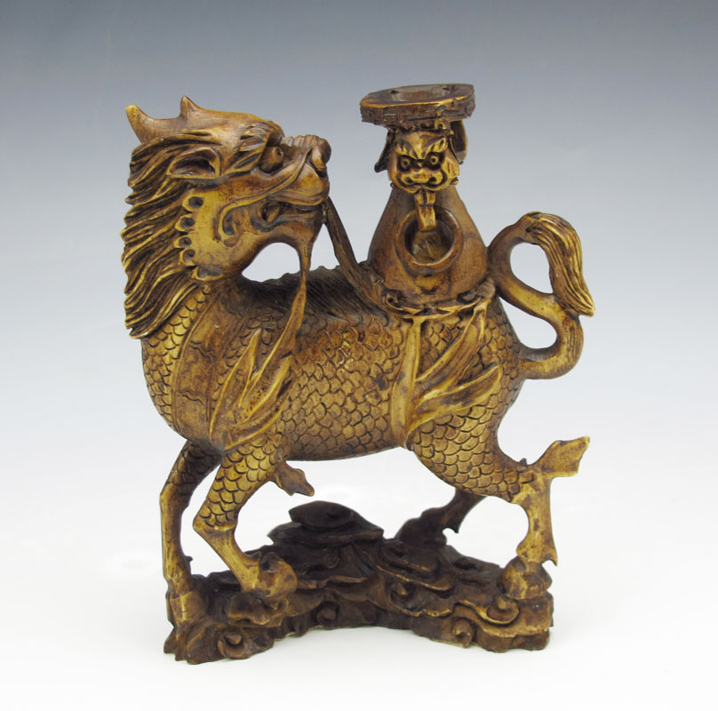 CHINESE MYTHOLOGICAL BUFFALO CARVED IVORY FIGURE: Figural buffalo with hooves and scales and palace seat on back. Unsigned. 5'' h. x 4'' x 2''.