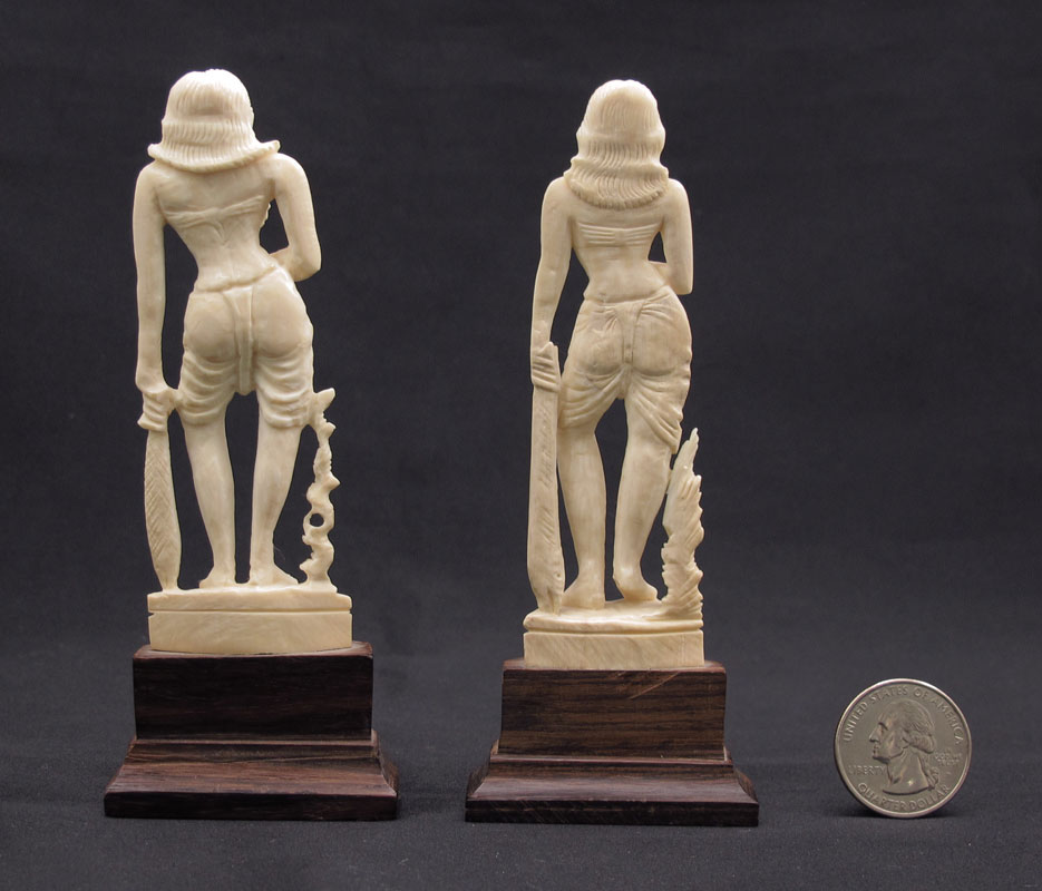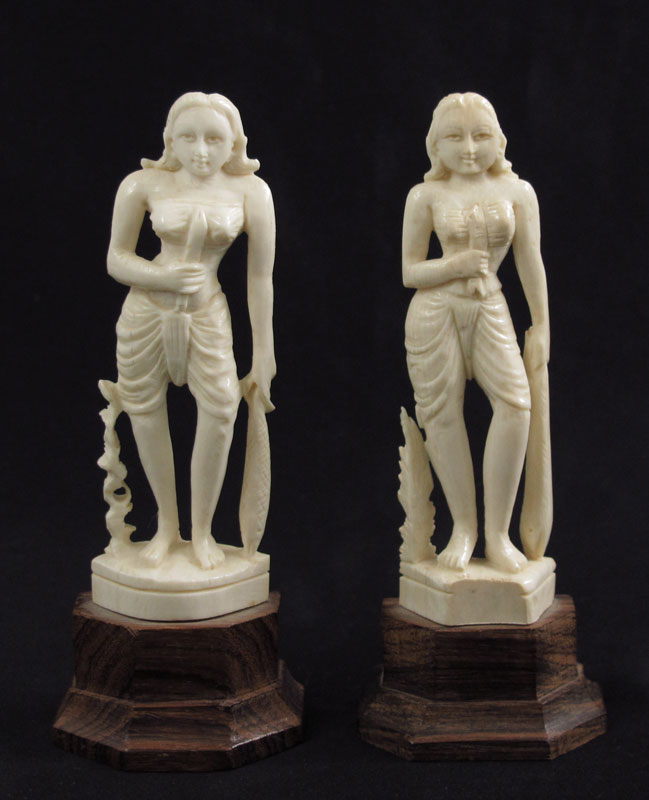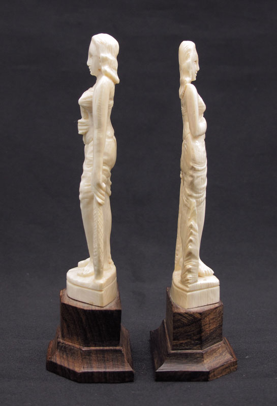 2 CARVED IVORY FEMALE FIGURES: Pair of women holding knife in one hand, fish in other. Slight differences between the 2. Both affixed to wood plinth. Overall 5'' high.