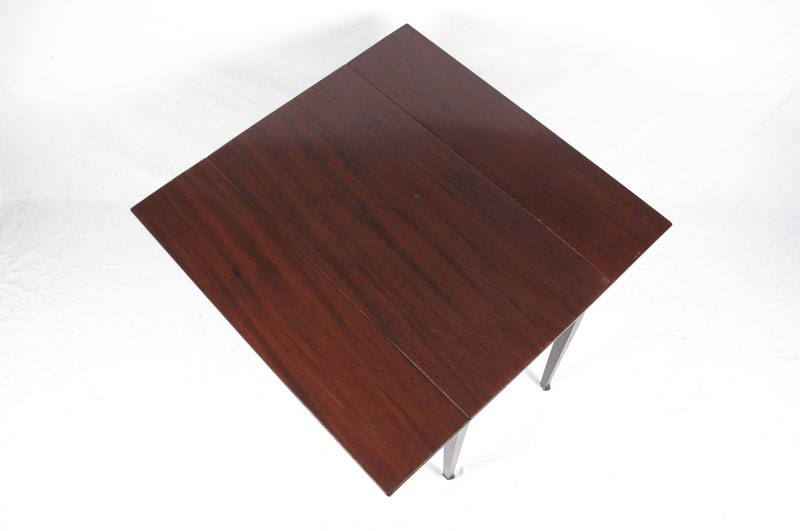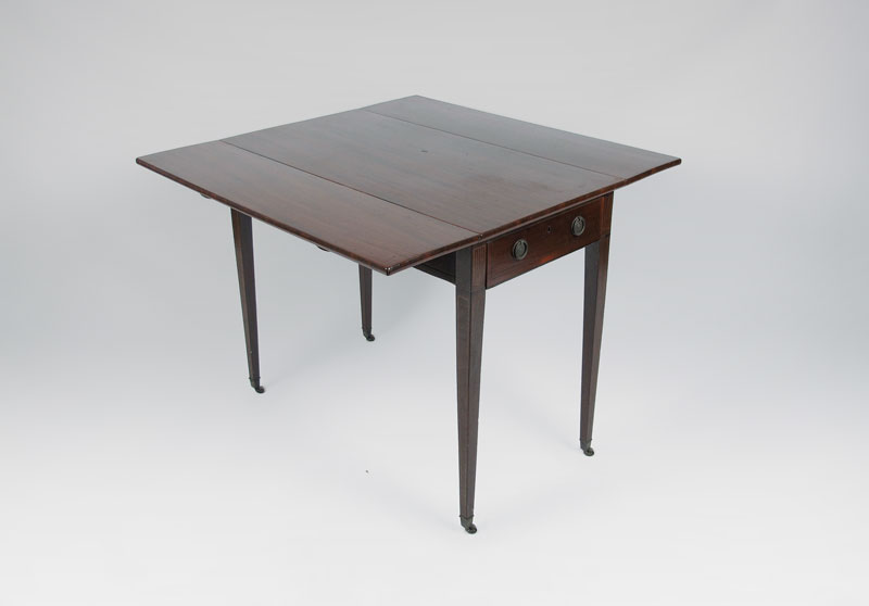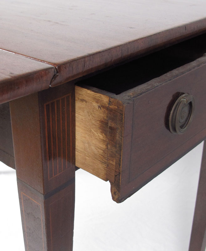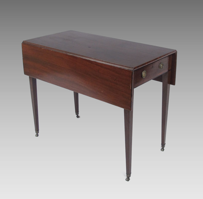 EARLY MAHOGANY PEMBROKE TABLE: Drop leaf table on string inlay tapered legs ending in brass cap and casters. Drawer on each end with double brass pull and lock. Measures 28 1/2'' tall x 36'' wide x 19'' deep. Leaves are 9''.
