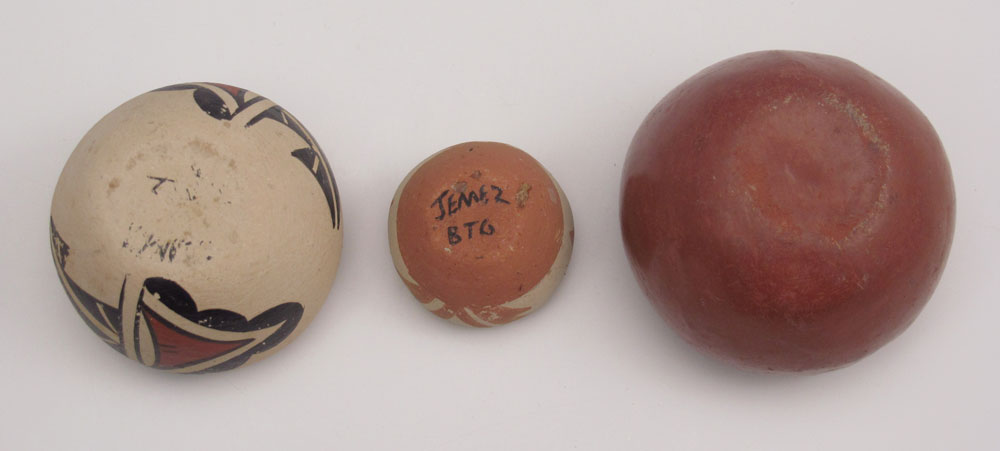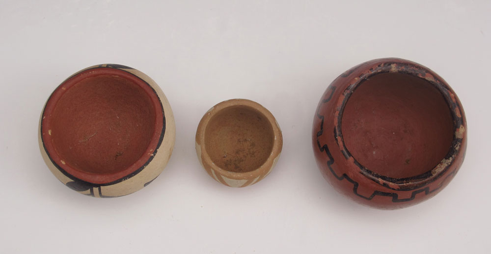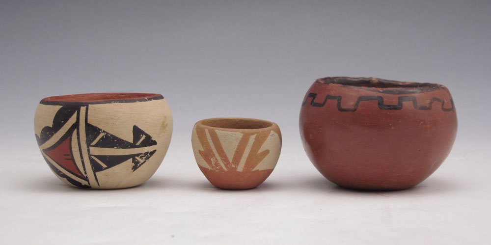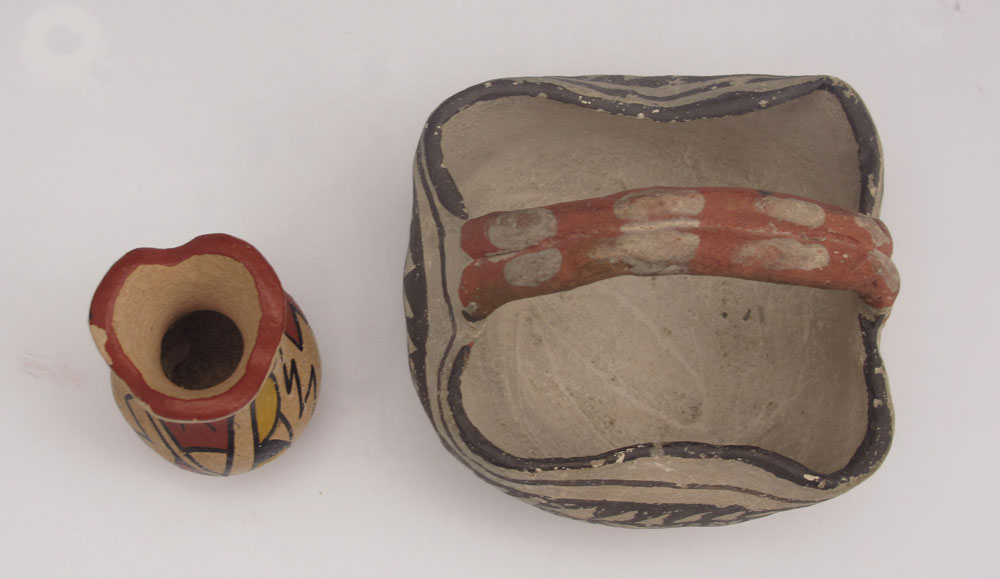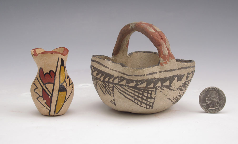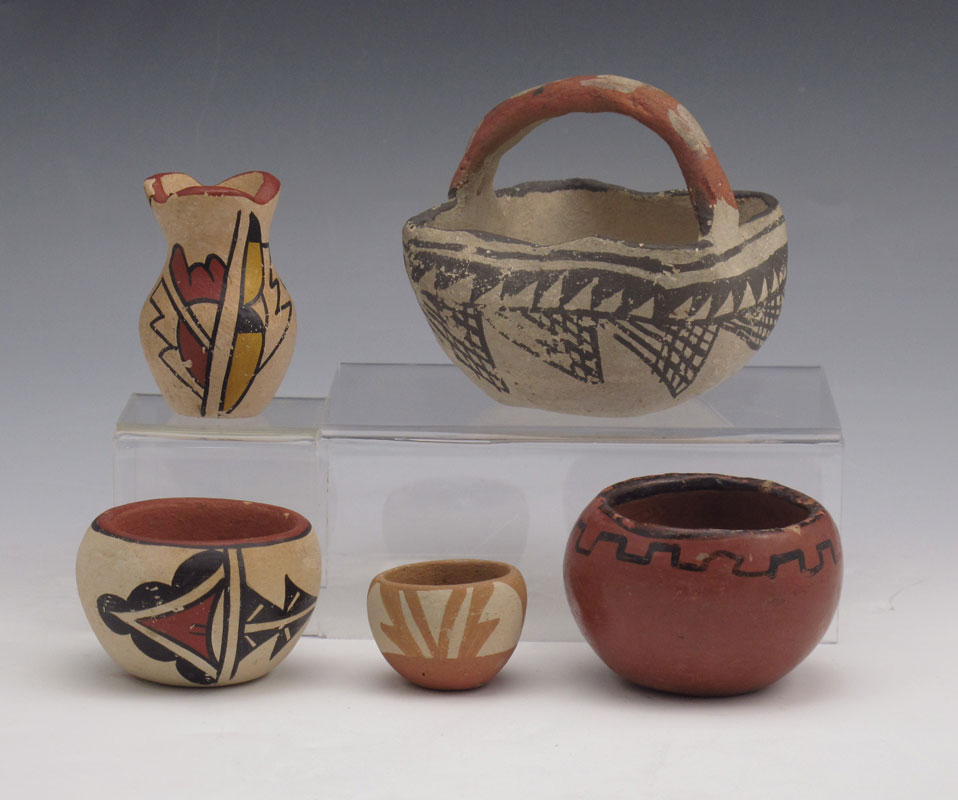5 PIECE ACOMA & SOUTHWEST POTTERY: To include 1) Polychrome Acoma basket, geometric design unsigned. 3 1/4'' x 3 3/8'' x 3 1/4''. 2) Small bowl, illegibly signed, geometric design. 1 3/4'' x 2 3/8''. 3) Small red painted bowl, unsigned, simple design. 1 3/4'' x 2 1/8''. 4) Miniature bowl, signed Jemez BTG. 1'' x 1 3/8''. 5) Polychrome small vase, unsigned. 2 3/8'' x 1 1/2''.