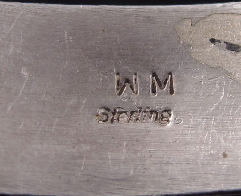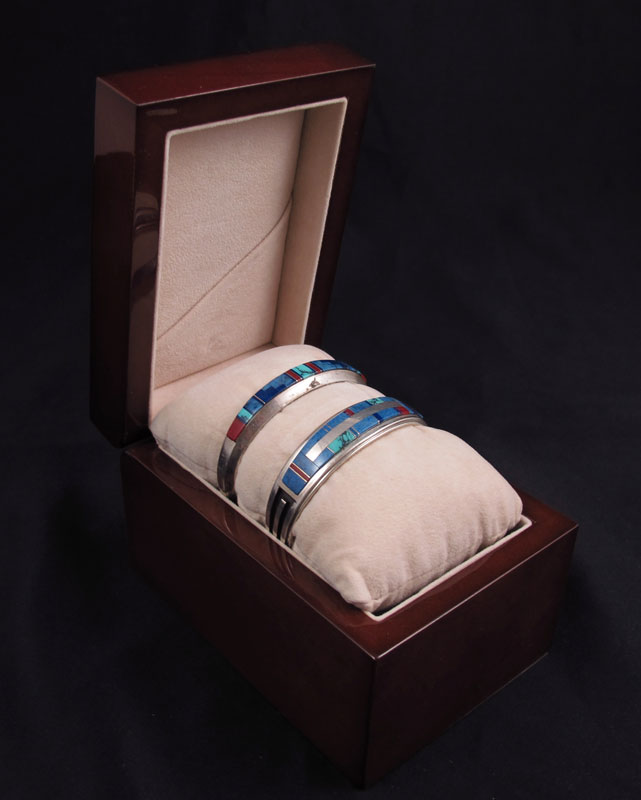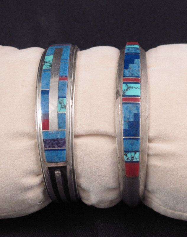 2 ZUNI INDIAN STERLING BRACELETS: Native American Indian cuff bracelets channel inlaid with turquoise, coral, & lapis, both marked Sterling WM, openings 1 1/8'' & 1 1/4'', each interior measures 2 1/4'' x 1 3/4''.