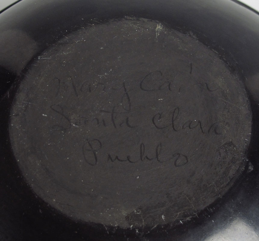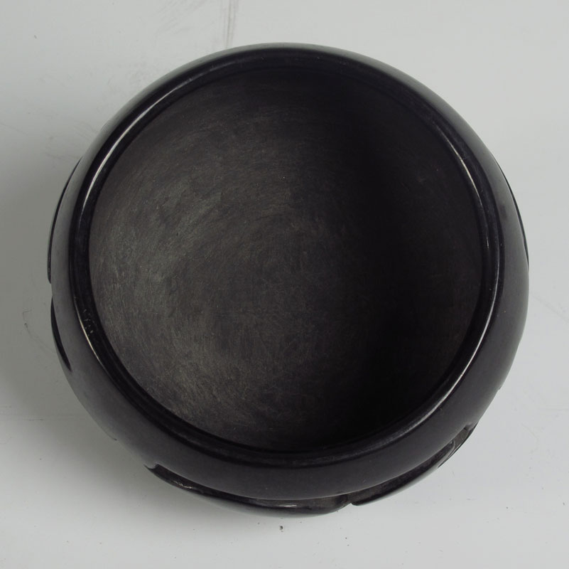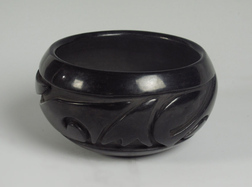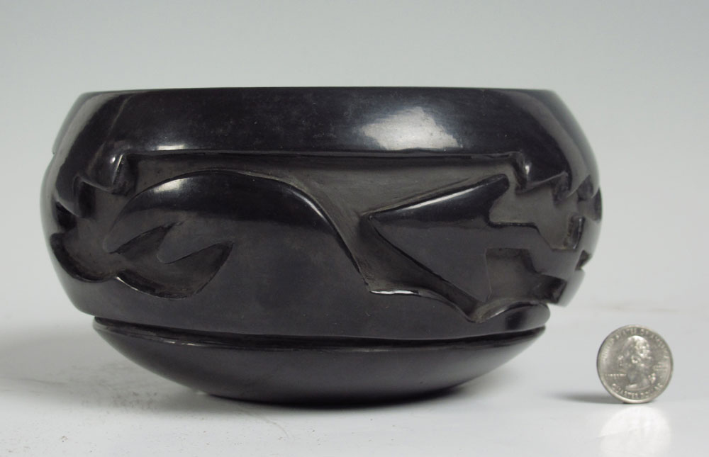 MARY CAIN SANTA CLARA PUEBLO POTTERY BOWL: Carved figural serpent design, signed Mary Cain Santa Clara Pueblo. 4'' h. x 7 1/4''.