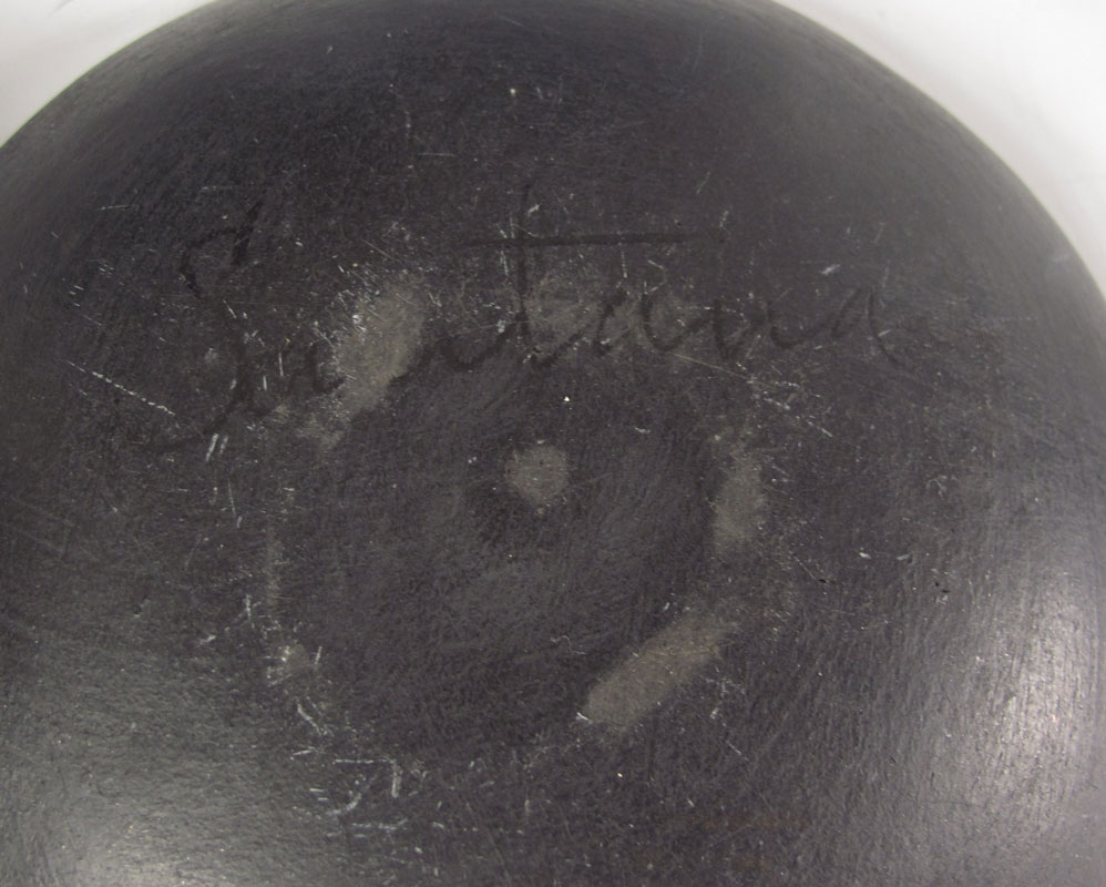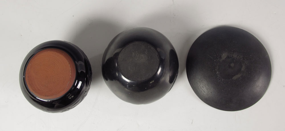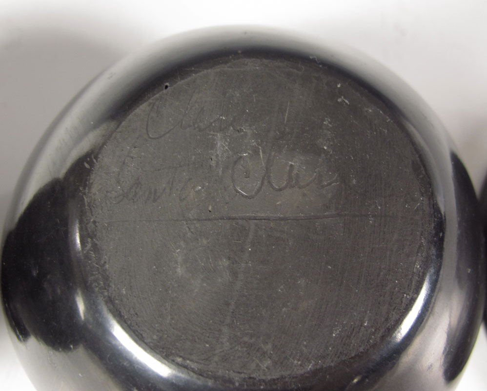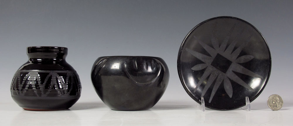 3 PIECE COLLECTION SANTA CLARA PUEBLO POTTERY: To include 1) Small bowl with impressed design, illegibly signed Clare Suaz? Santa Clara. 3 1/4'' x 4 3/4''. 2) Underplate with etched design, illegibly signed Sautana?. 5 5/8'' dia. 3) Santa Clara style vase with carved figures, signed Tenley? Pottery. 3 7/8'' h. x 4'' dia.