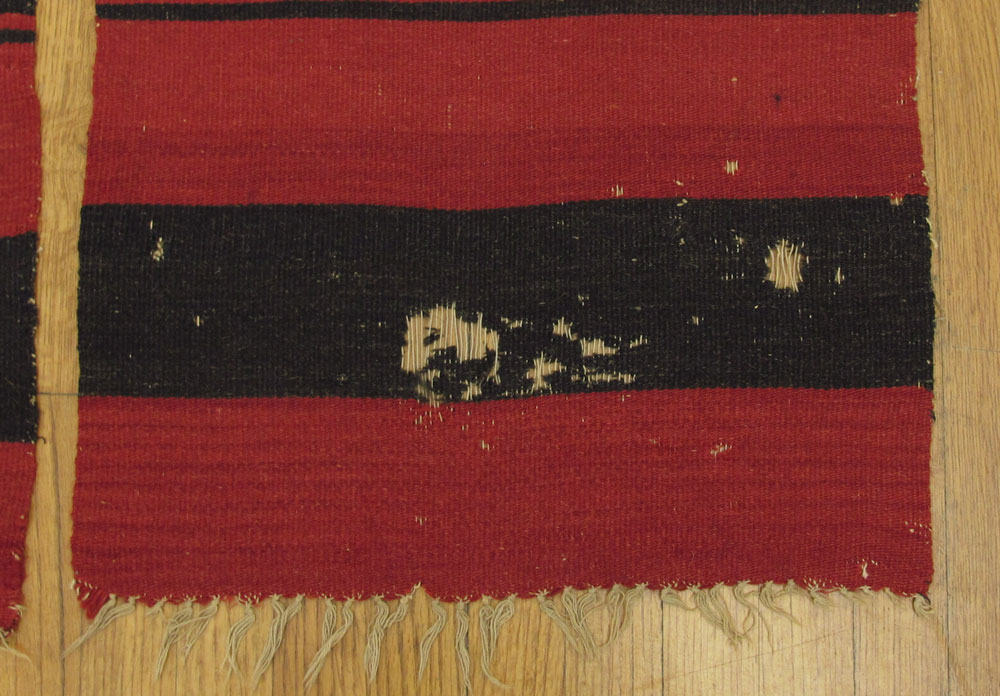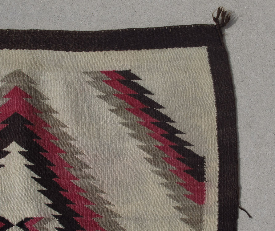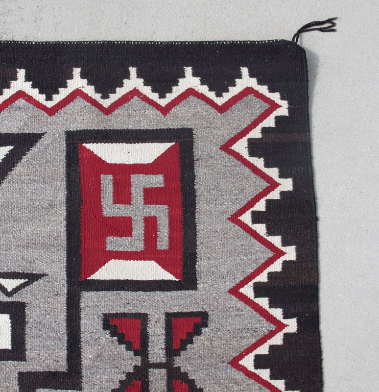 LOT OF 3 NATIVE AMERICAN RUGS: 1) American Navajo hand woven wool rug, 4' 5'' x 6' 4''. This fine example of pre-World War II native weaving uses both natural and dyed wool with a field crowded with different design motifs including what we now call Swastikas' in gray on a red ground. These designs have also been referred to as pinwheels and are an ancient symbol for eternity, not the evil connotation from war time. The stepped black lines have sometimes been linked with lightning bolts, or mountains or rivers. The diamond edge border in red, black and white tell us that this is a 20th century weaving as most earlier rugs had no borders. Condition is very good. 2) This lot consists of four hand woven wool bands, 20'' wide x 8' 10''. These bands were all woven on the same loom by the same person with the intent to be joined together to make one large rug/blanket. The dramatic black and red bands and the diamond medallion in the center can be lined up to match very well, although the lengths of the bands vary. The overall effect is powerful. There is some moth damage on each of the bands, but no current activity. 3) American Navajo hand woven wool rug, 2' 8'' x 3' 7''. This simple mid 20th century rug has design of radiating diamonds in black, red, and gray, on an ivory field, bordered by a brown-black edge. There are some stains and some color runs. Sold as a lot.