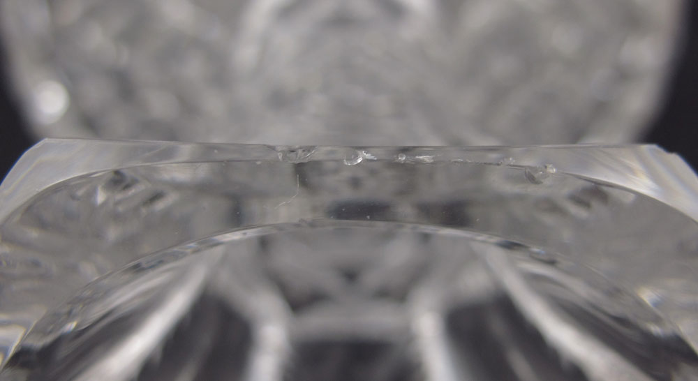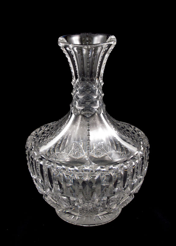 SIGNED LIBBEY CUT GLASS CARAFE: American Brilliant cut glass at its best. Open carafe signed on the shoulder with the earlier Libbey backstamp. 8 3/4'' tall.