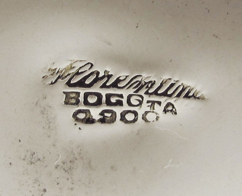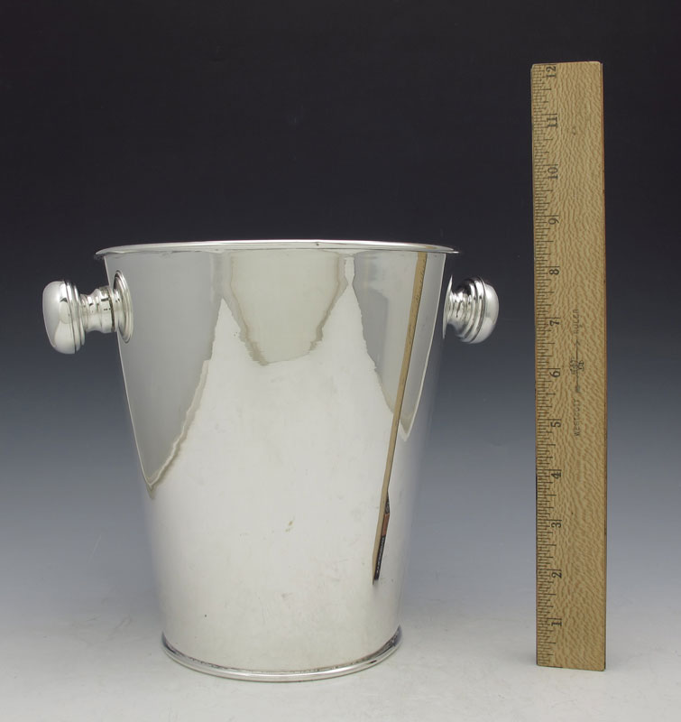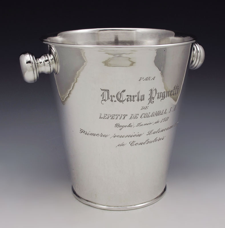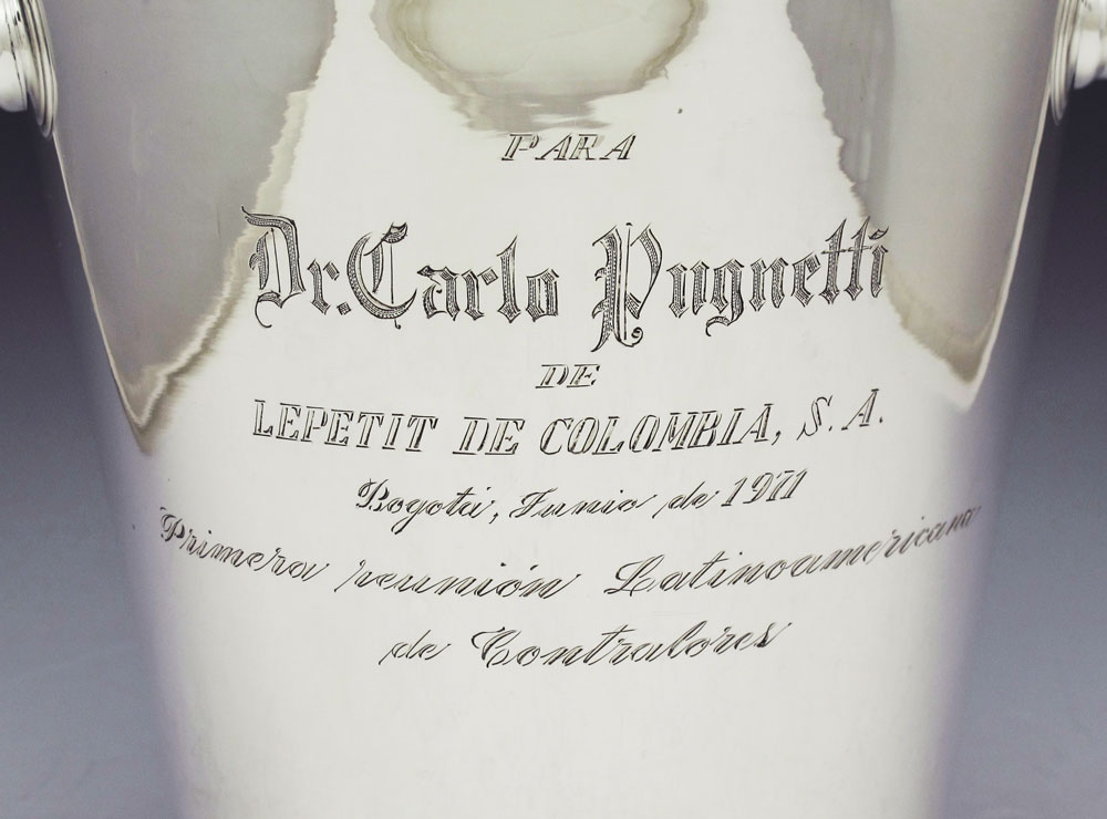 COLUMBIAN 900 FINE SILVER ICE BUCKET: Presented to Dr. Carlo Pugnetti in 1971. Illegibly marked Florentine? Bogota 900 on base. 8 1/2'' h. x 10 1/2'' overall. Approx. 26.3 troy oz.