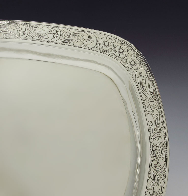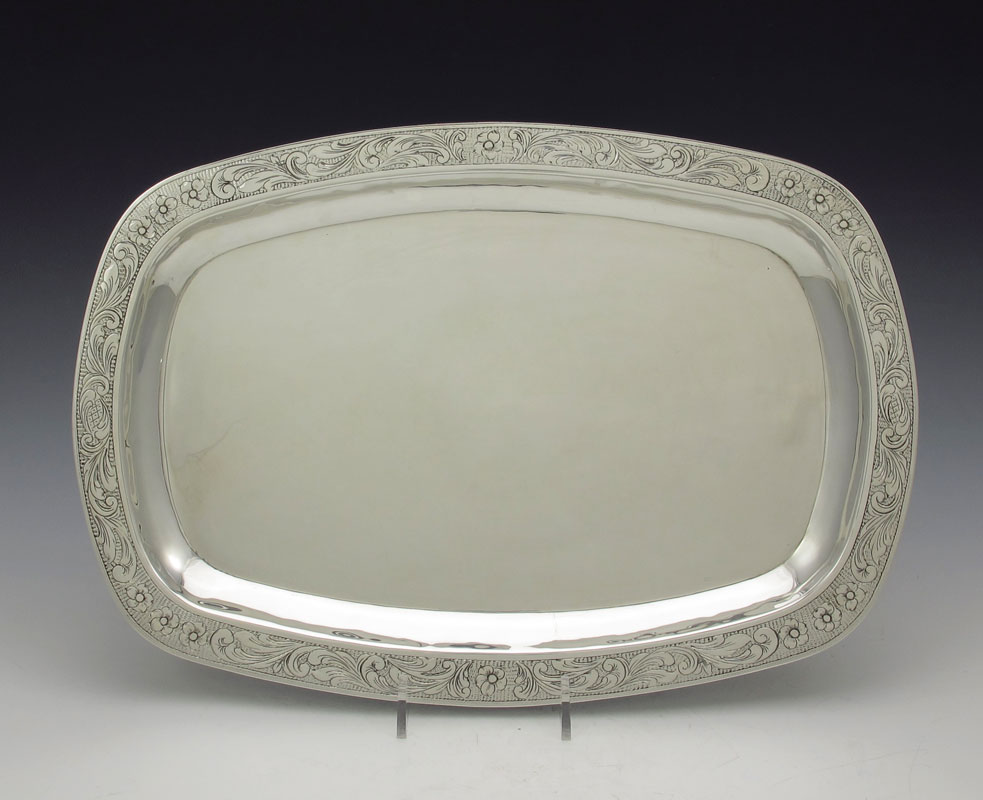 AVENEGAS COLUMBIAN 900 SILVER TRAY: Engraved floral & foliate scroll design. Marked Avenegas 900. 13 3/4'' x 9 1/2''. Approx. 12.5 troy oz.