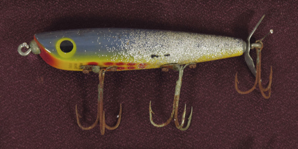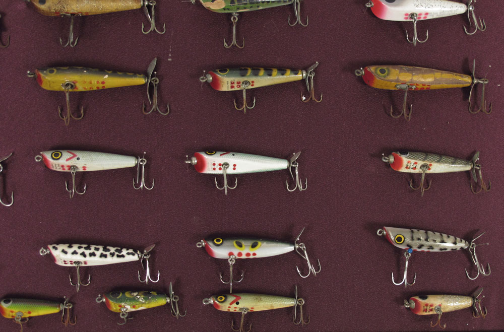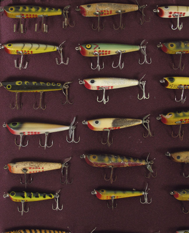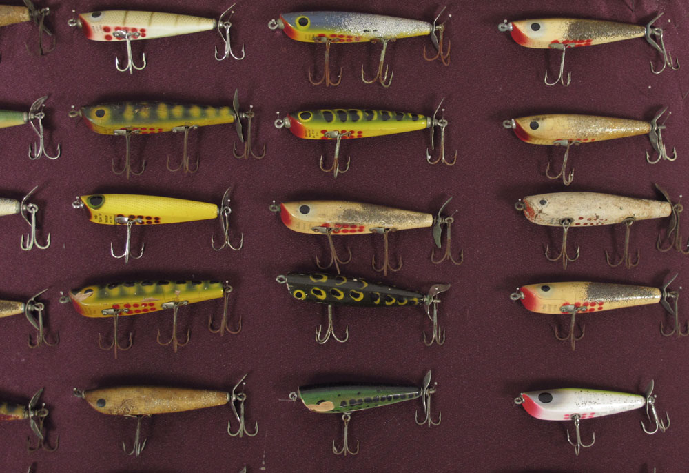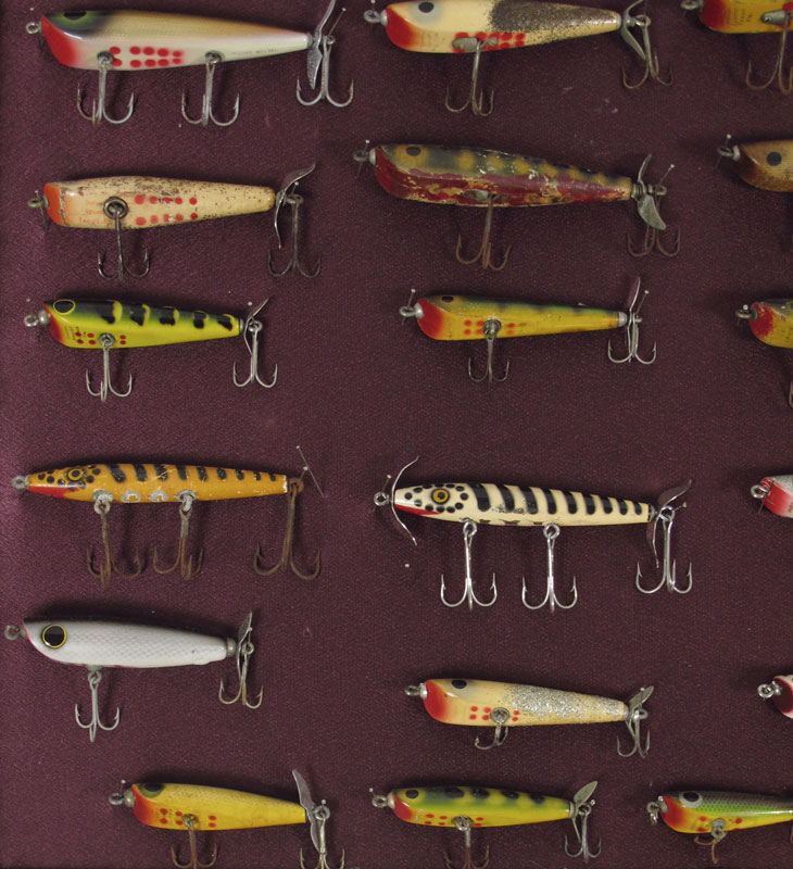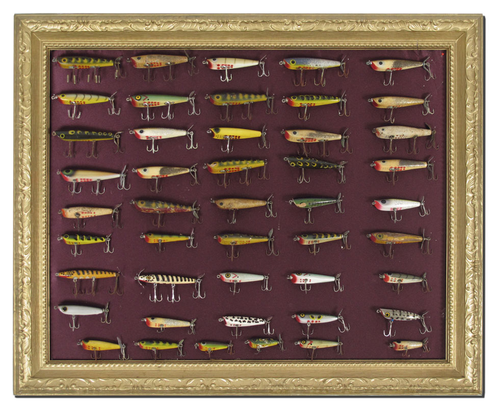 COLLECTION OF APPROX. 46 ''DALTON'' VINTAGE FISHING LURES: A fine assortment of these desirable Florida lures made in St.Petersburg, FL. Mounted on frame, 26 1/4'' x 32''.